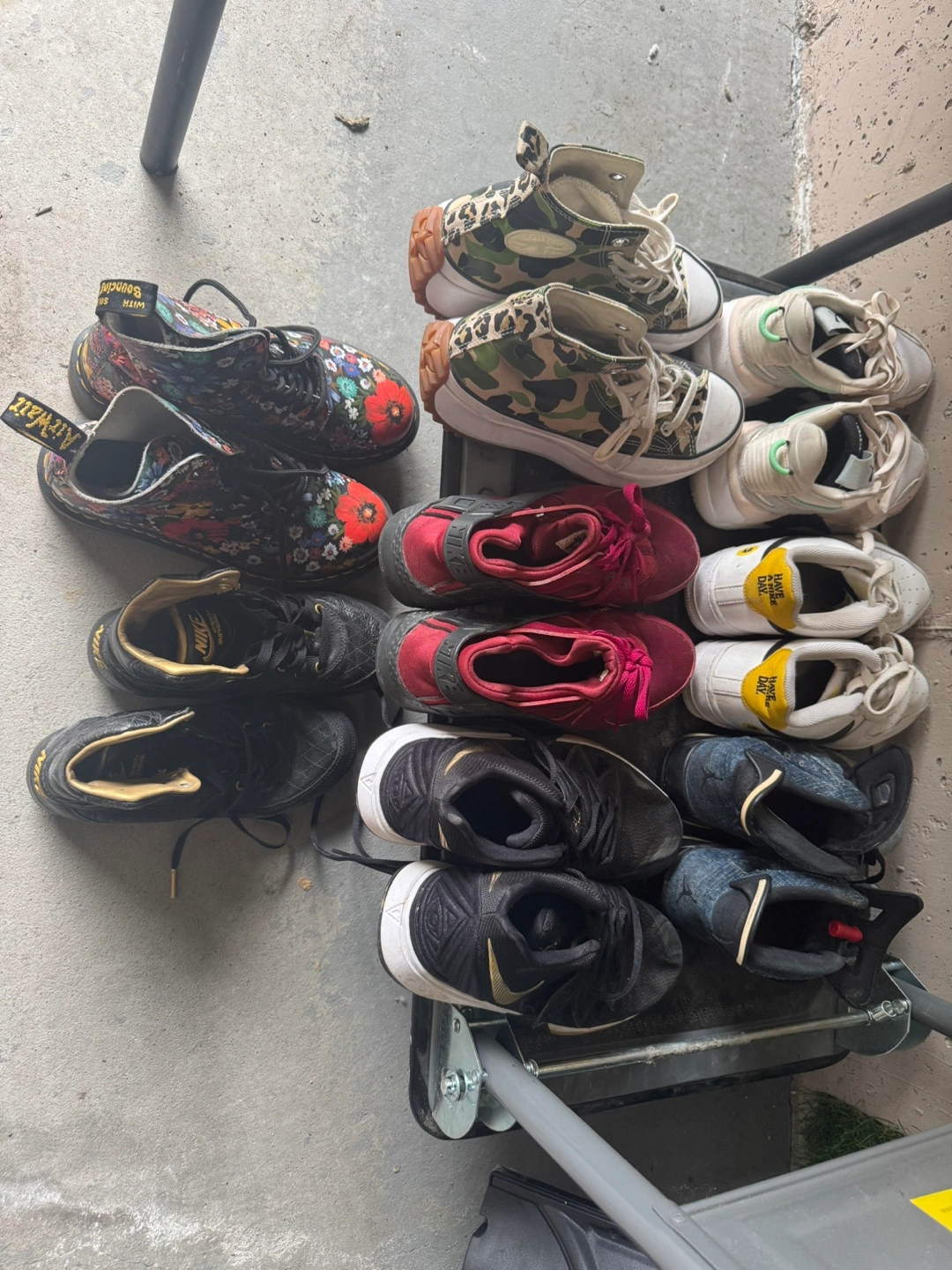 121Large collection of shoes. Includes Dr. Martens floral boots, camo Converse high tops, several Nike basketball shoes, and other various sneakers. Sizes vary.