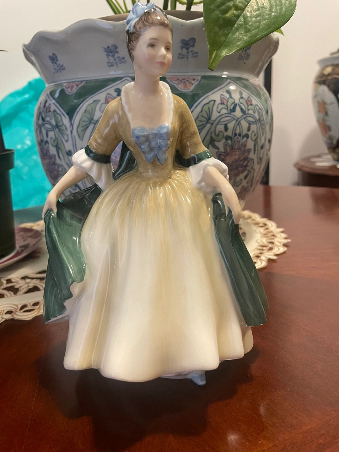 Two lovely Royal Doulton figurines. One depicts a lady in a gown, the other an older woman selling ribbon and silks . Collectible porcelain figurines. Pre-owned.
