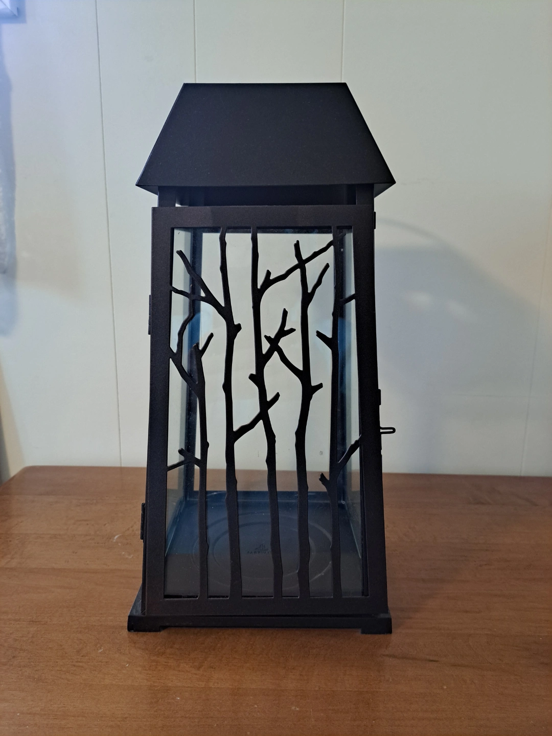 Black metal candle lantern. Features a glass enclosure with a branch cut-out design. Square base with a peaked roof top. Small carrying handle on top.