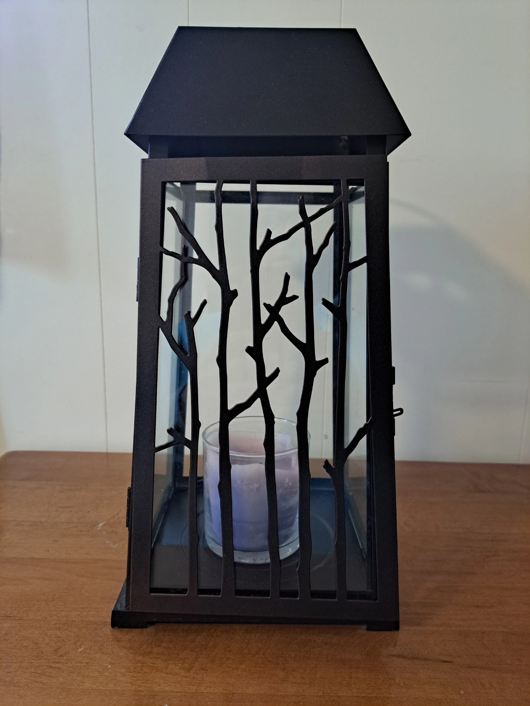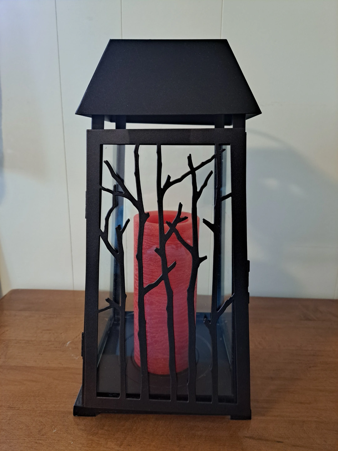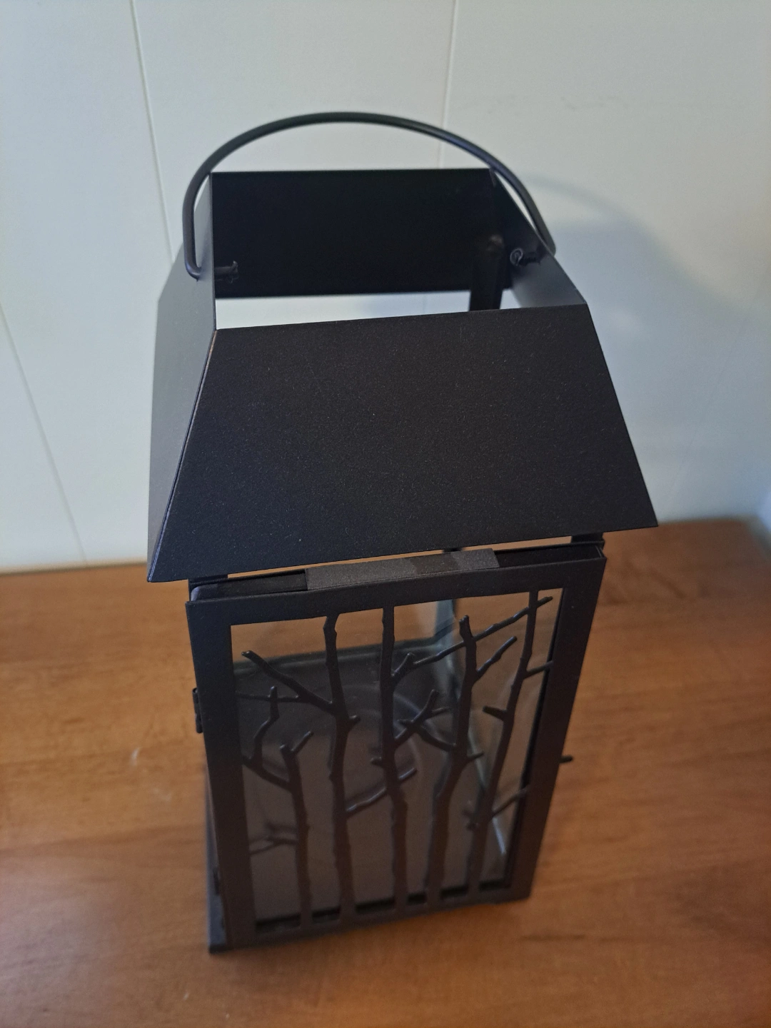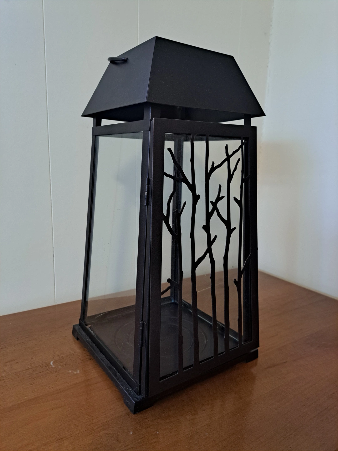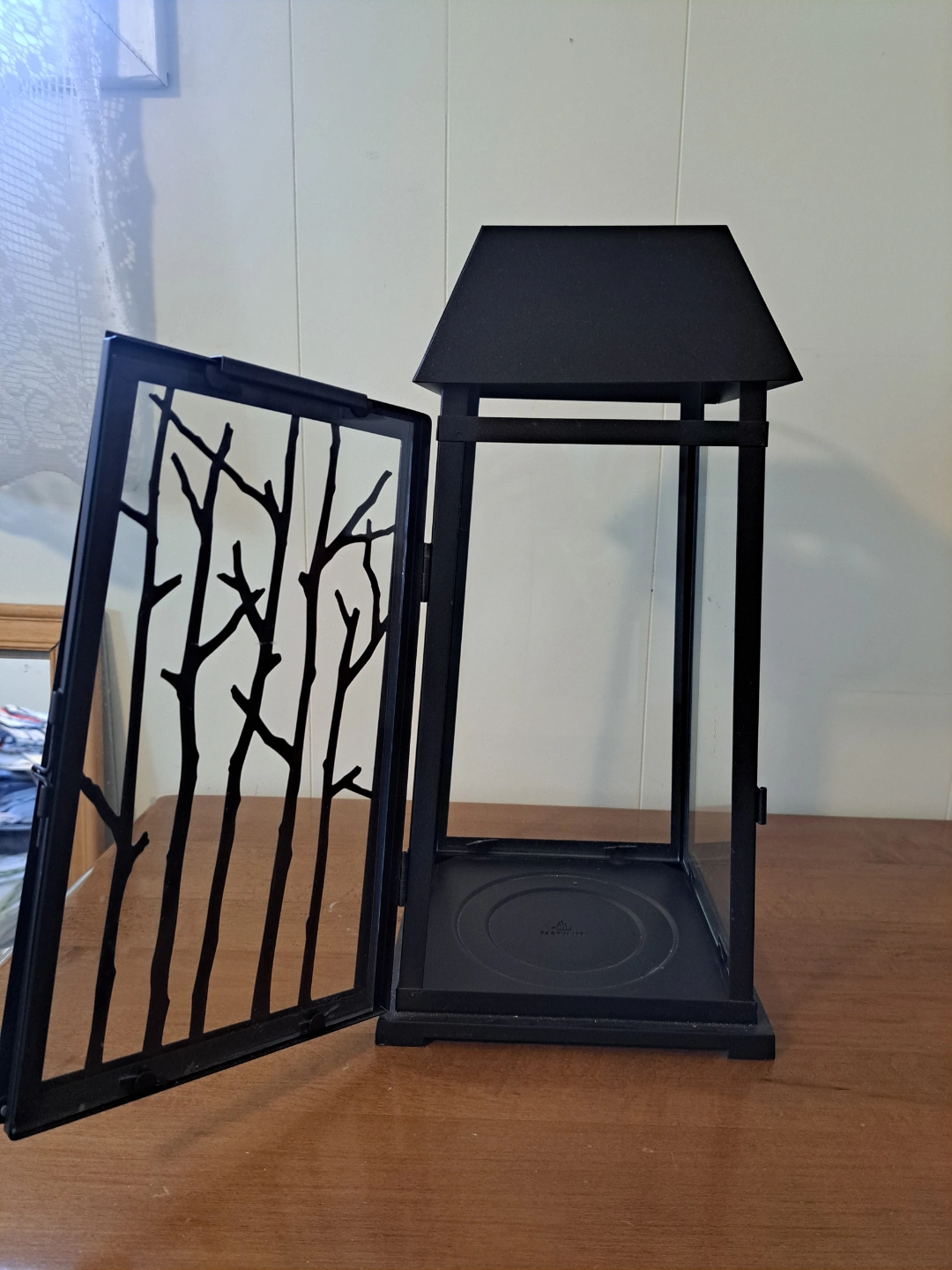 Black metal candle lantern. Features a glass enclosure with a branch cut-out design. Square base with a peaked roof top. Small carrying handle on top.