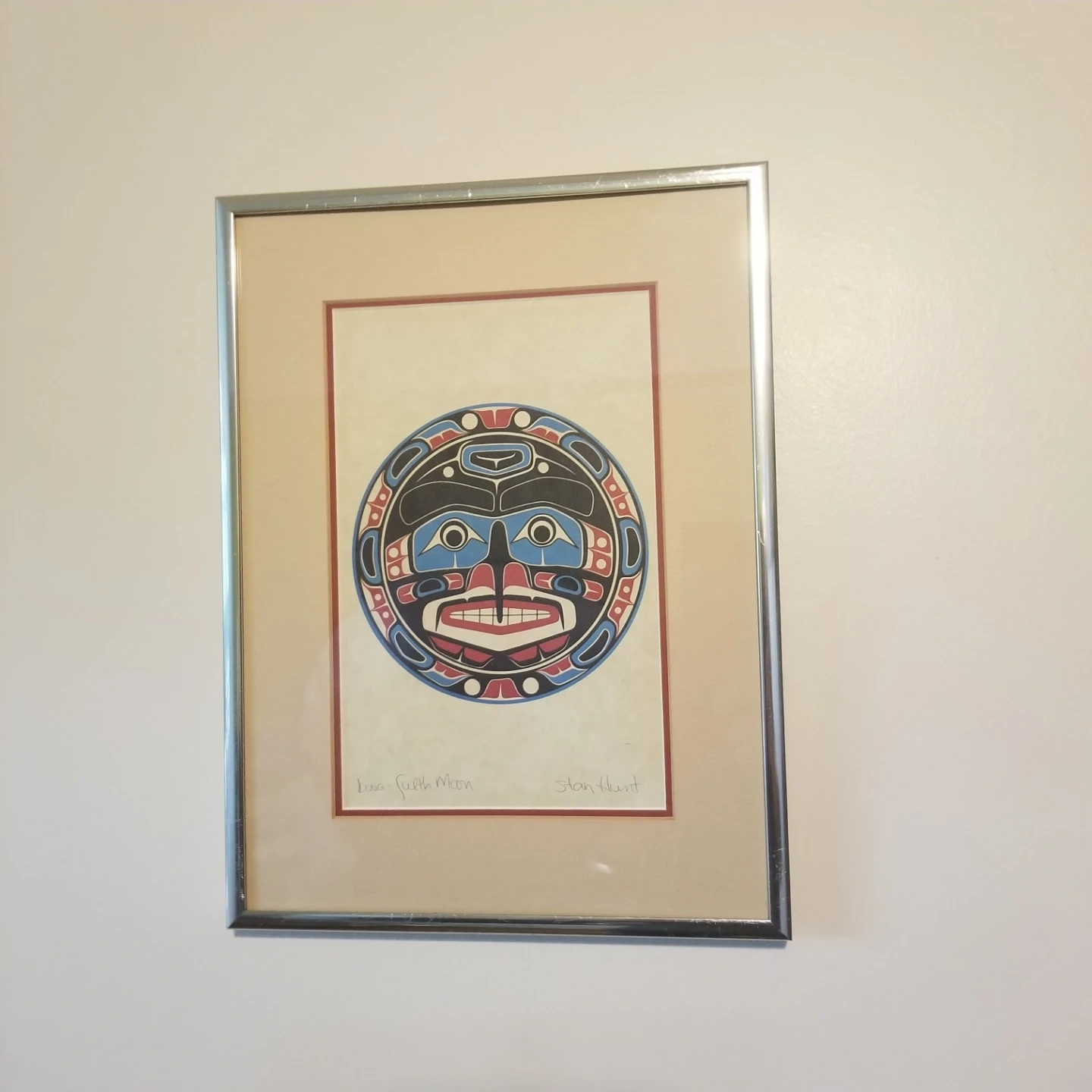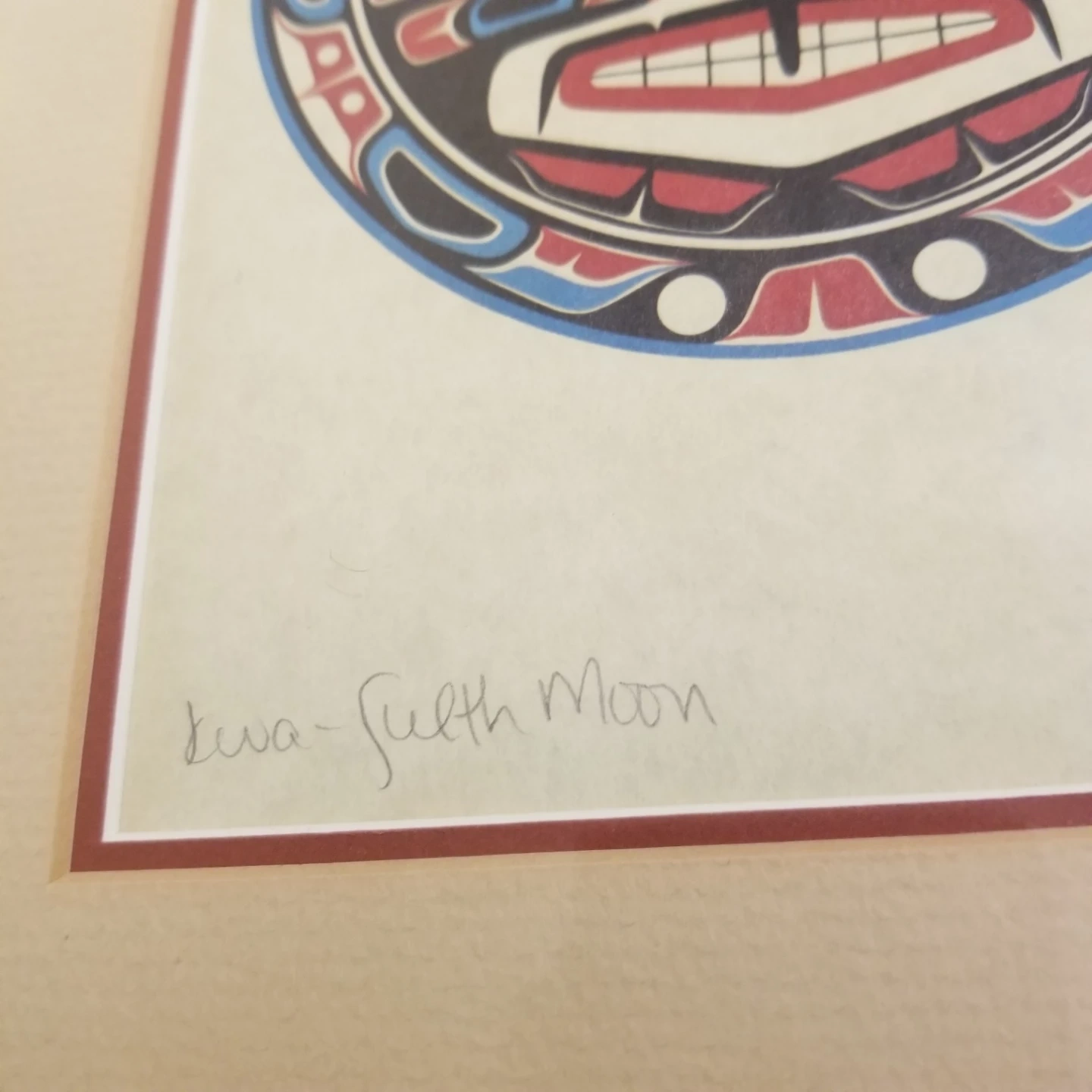 Beautiful framed print featuring First Nations art. Artist signature included. A lovely piece for any collector.