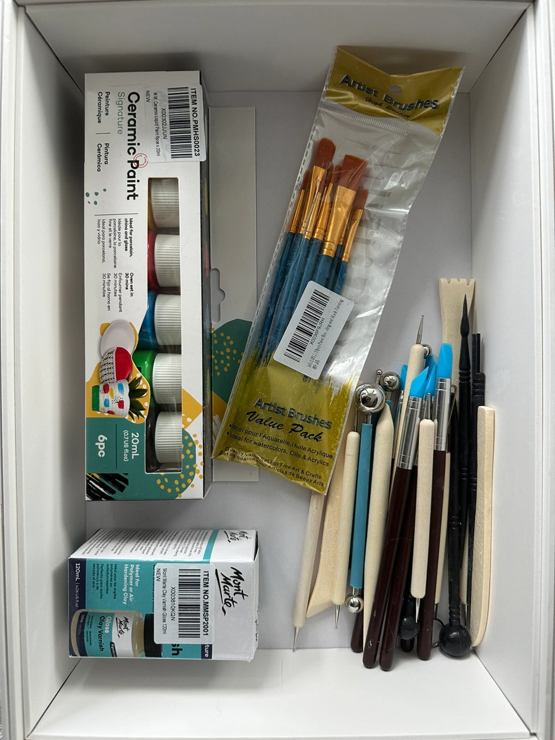 Set includes NEW ceramic paints, artist brushes, and OPENED various sculpting tools. Perfect for pottery, painting, or crafting projects. Mont Marte clay varnish also included.