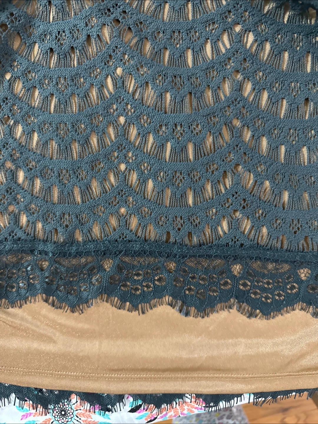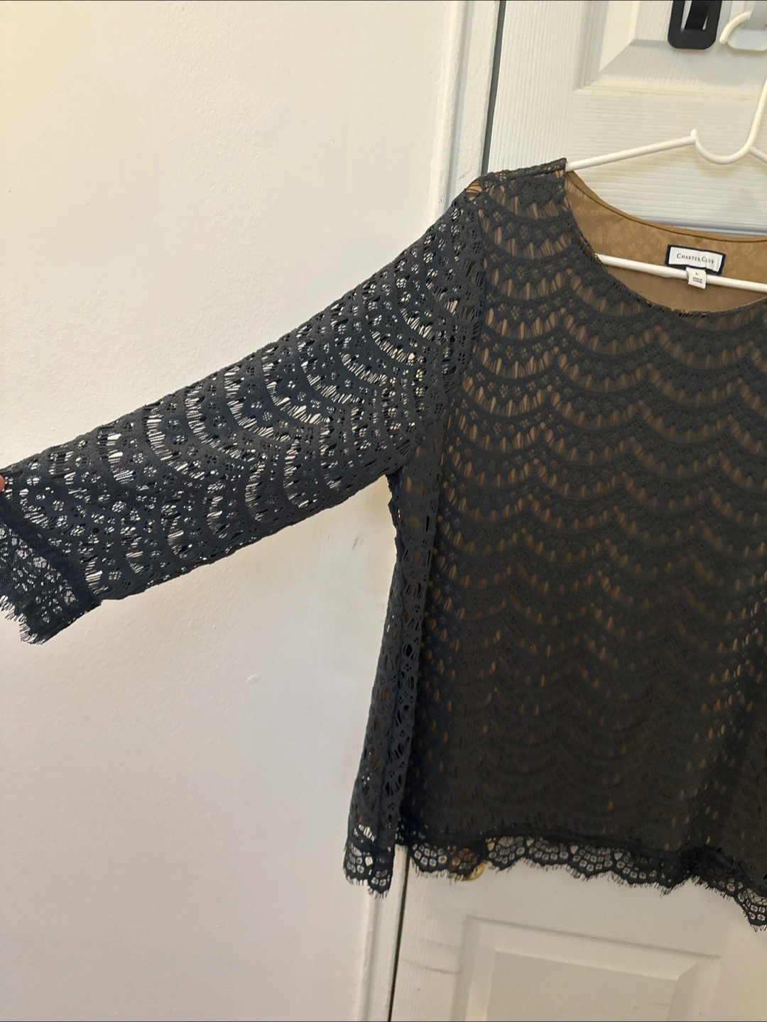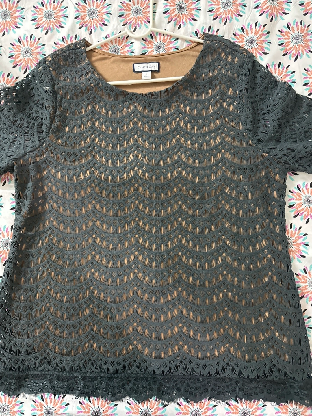 Beautiful dark gray lace top golden lining Features a round neckline, 3/4 sleeves, and a delicate lace trim. Size large.