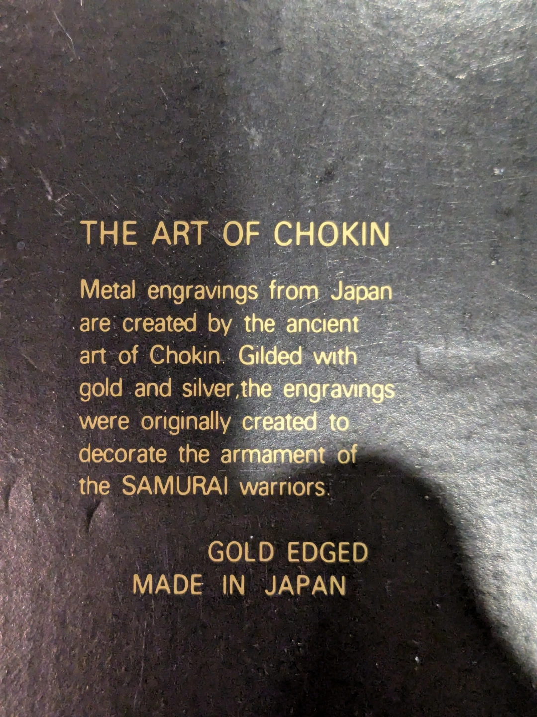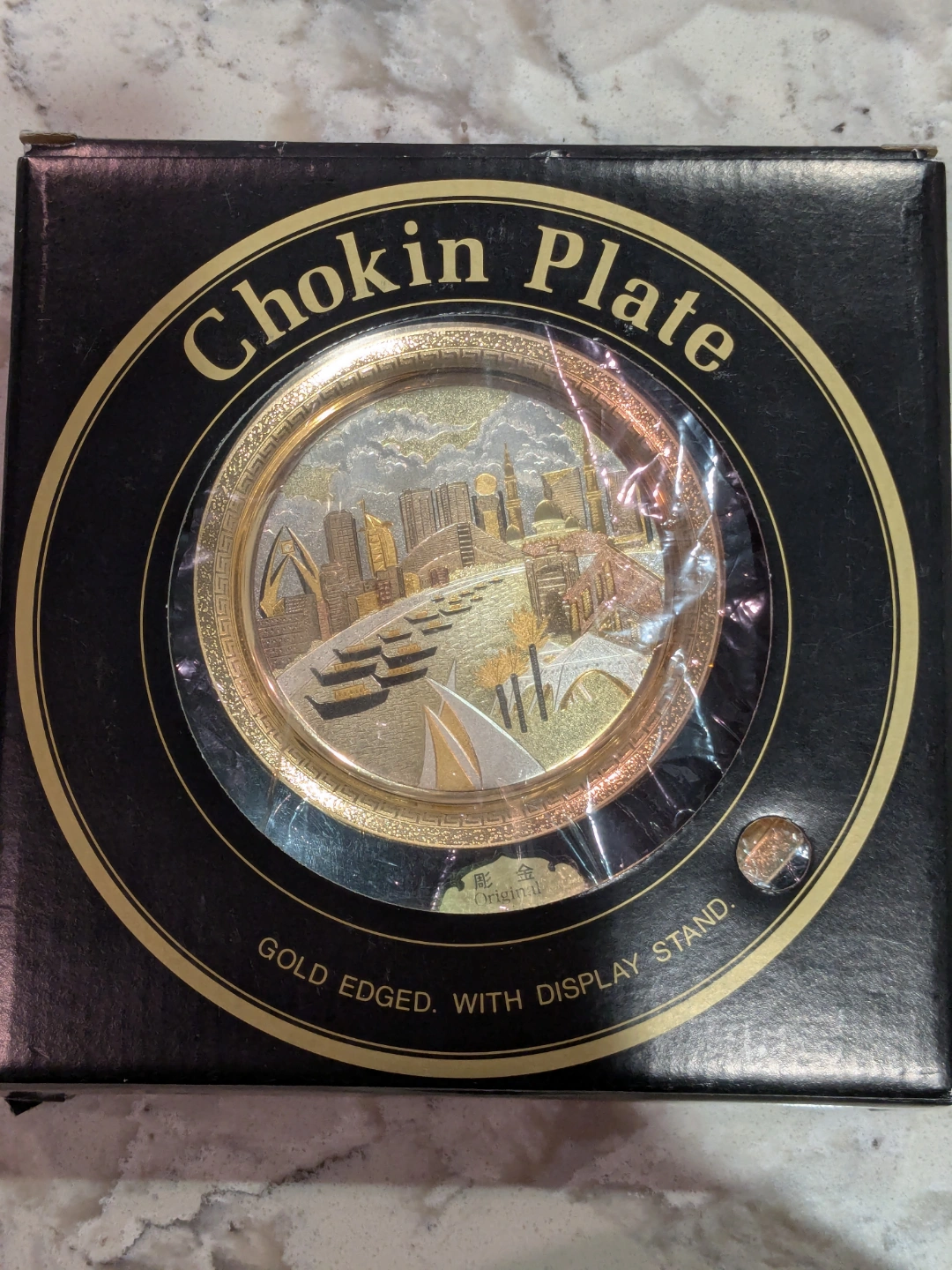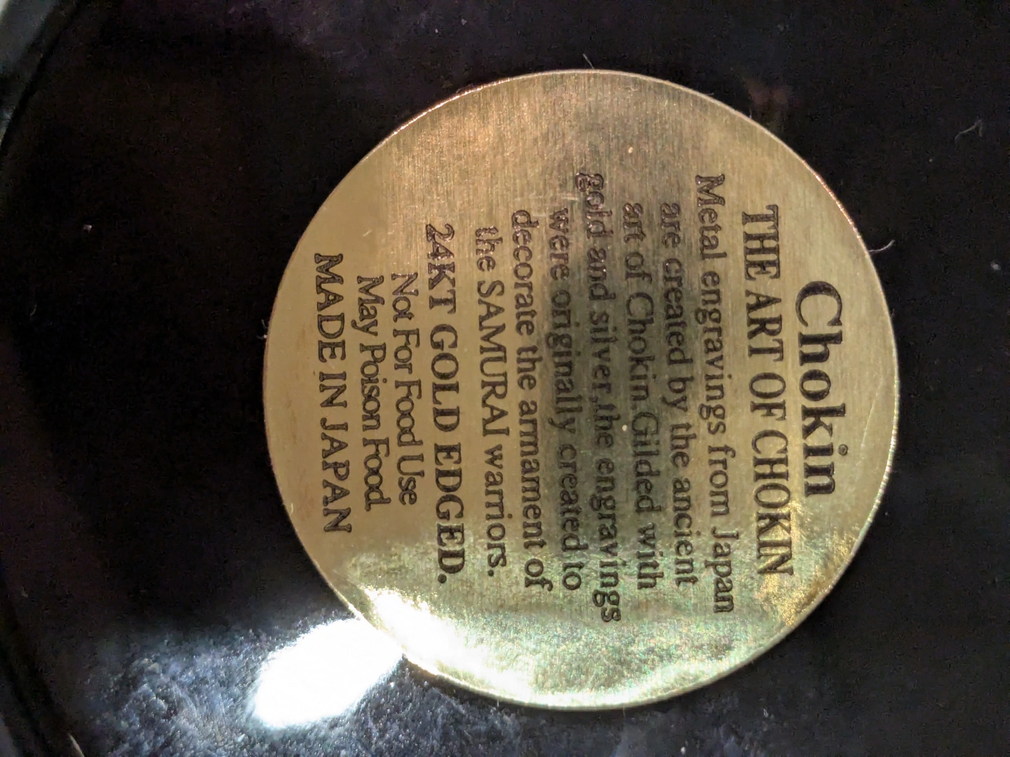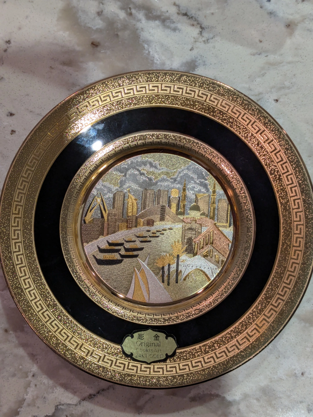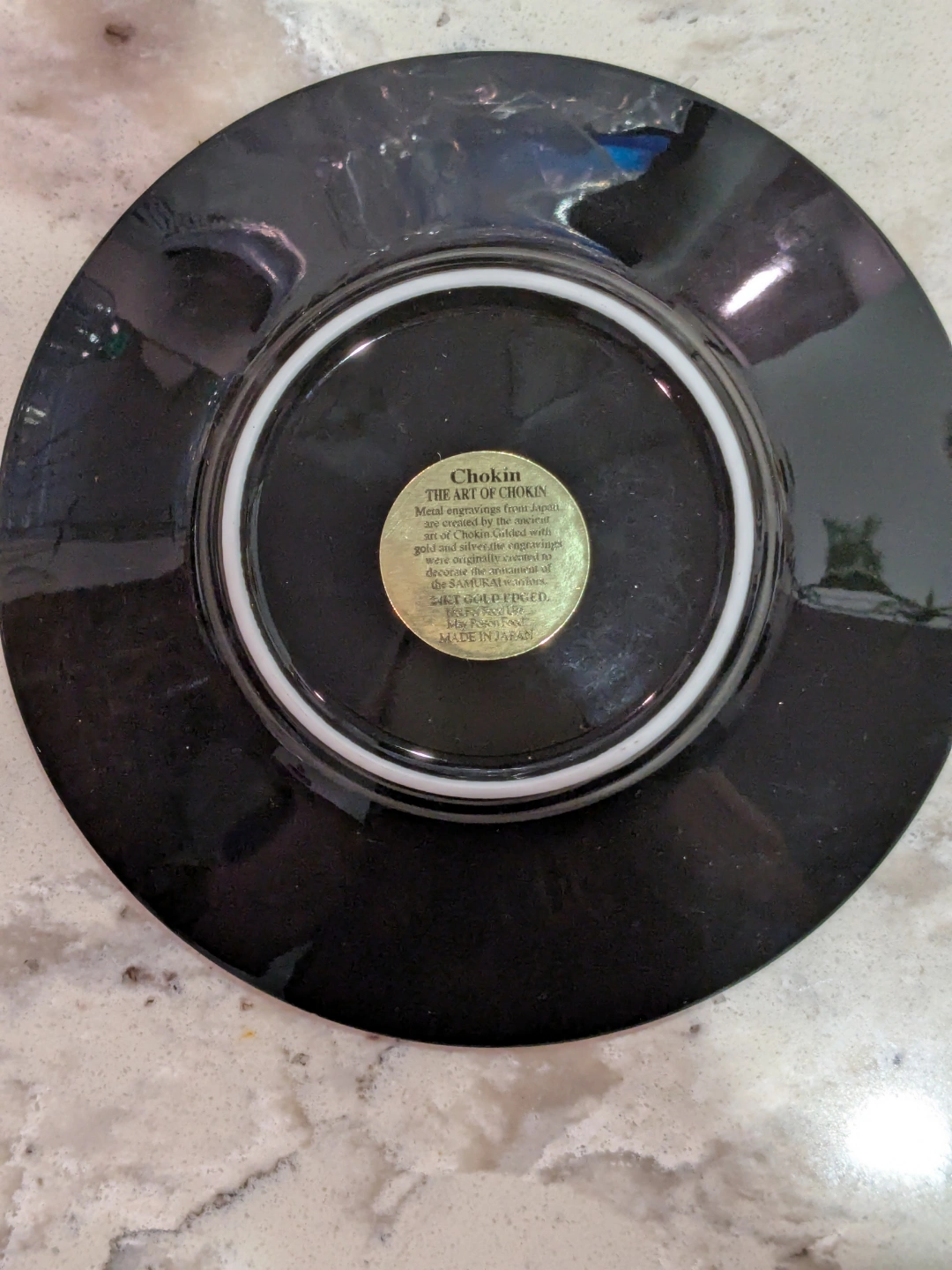 Vintage Collectible Japanese Chokin plate 24 K Gold Edge with display stand. Metal engravings from Japan are created by the ancient art of Chocking Gilded with gold and silver, the engravings were originally created to decorate the armament of the Samurai warriors.