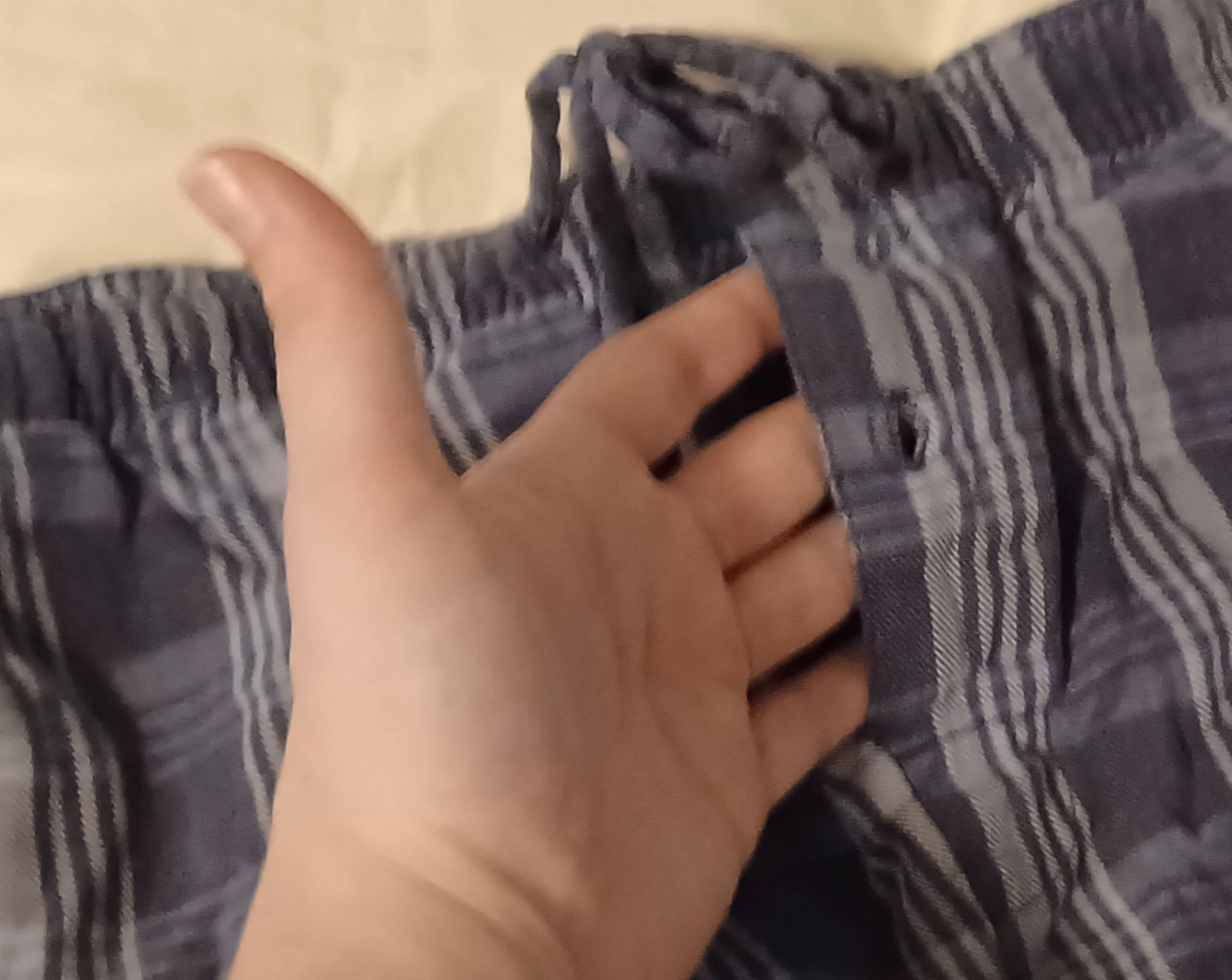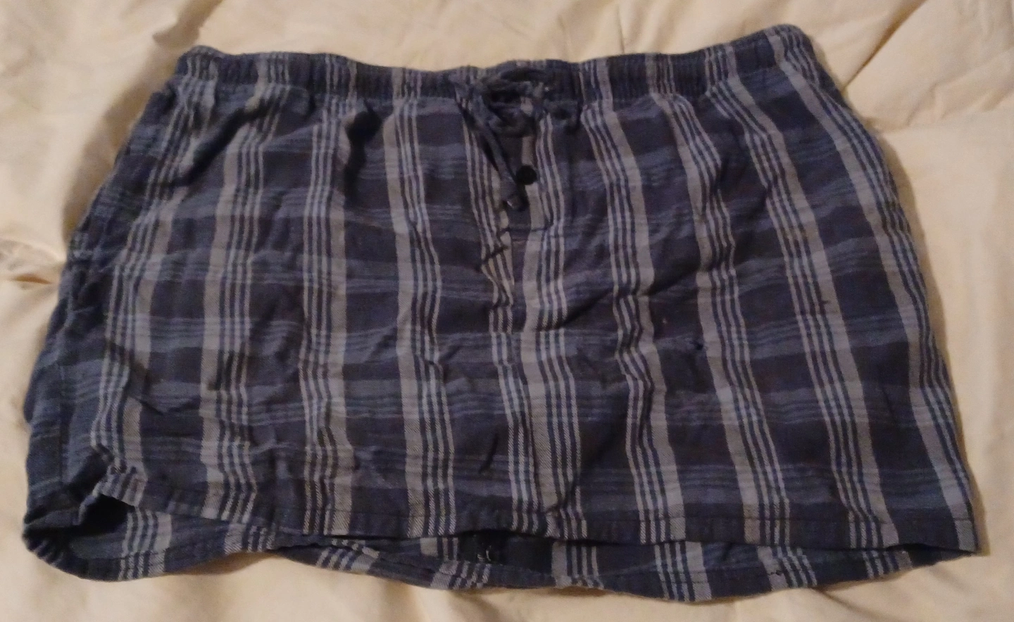 Men's pajamas rad-cycled into a dope unisex grunge skirt with 3 pockets. Blue and grey plaid pattern. Elastic waistband with drawstring. Comfortable and lightweight.