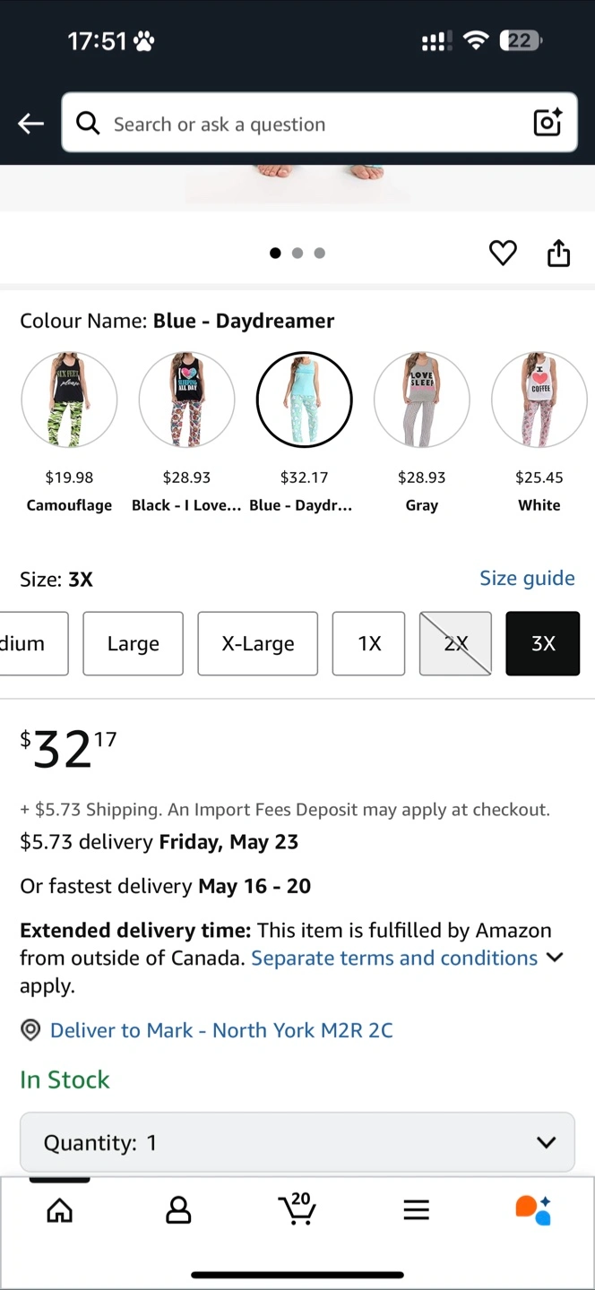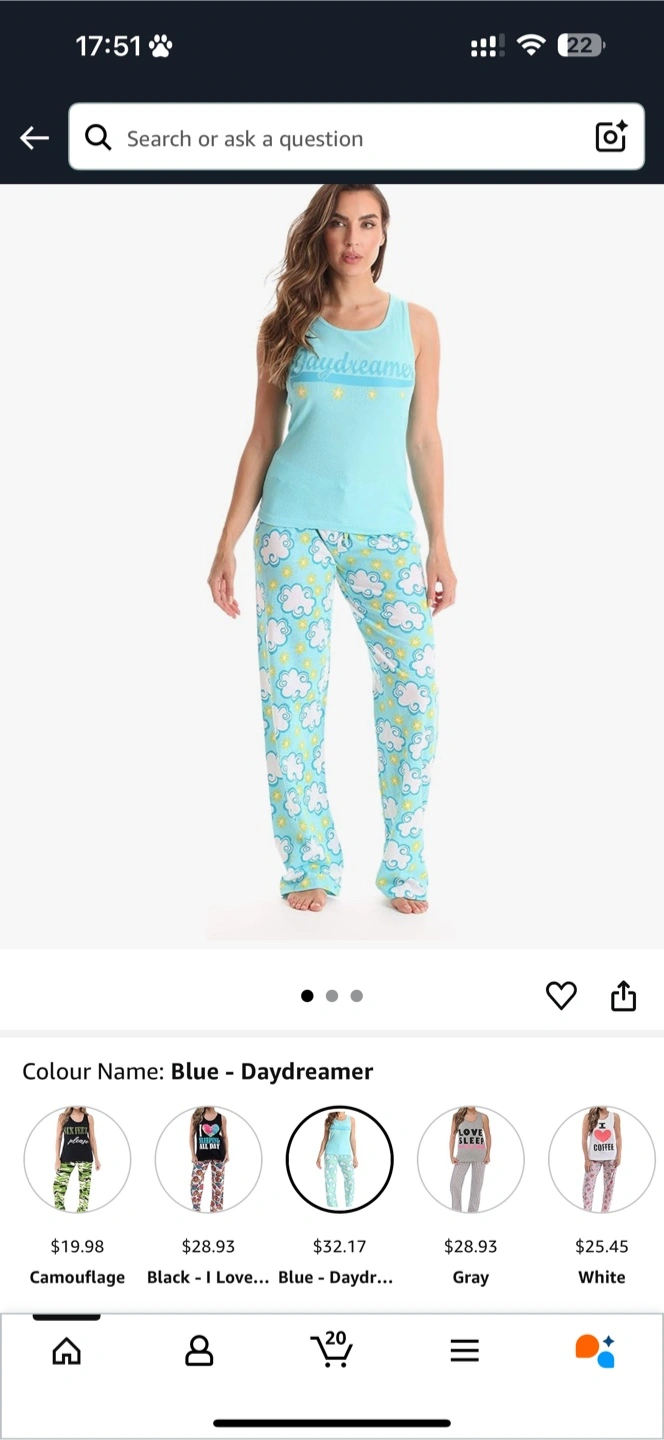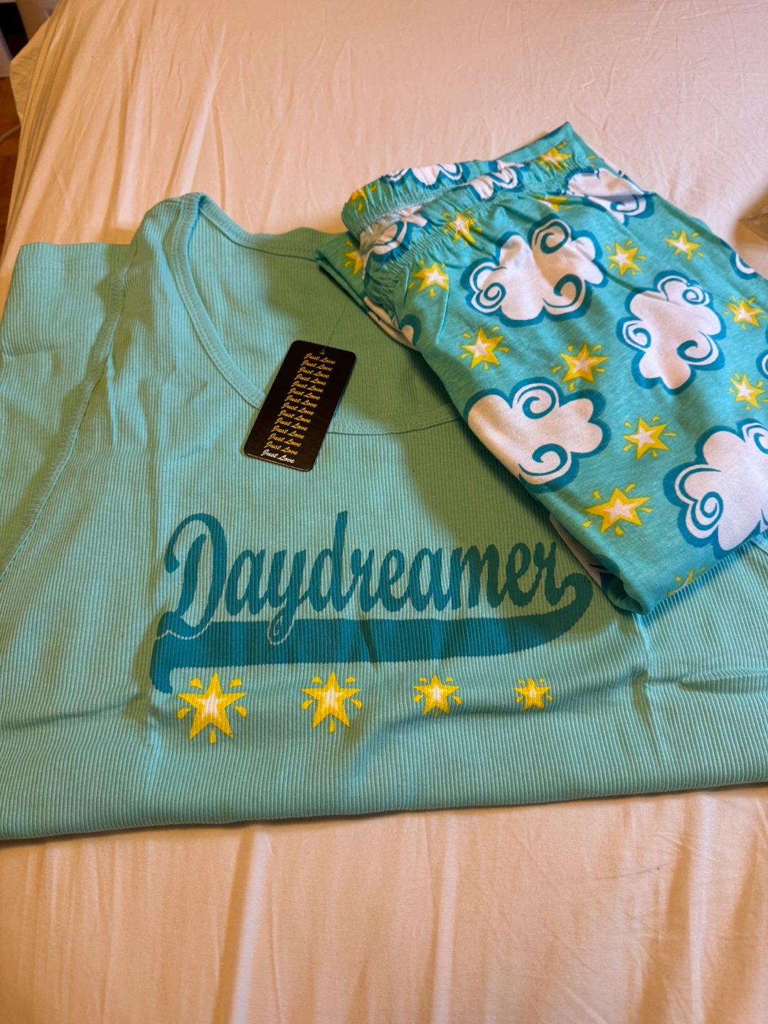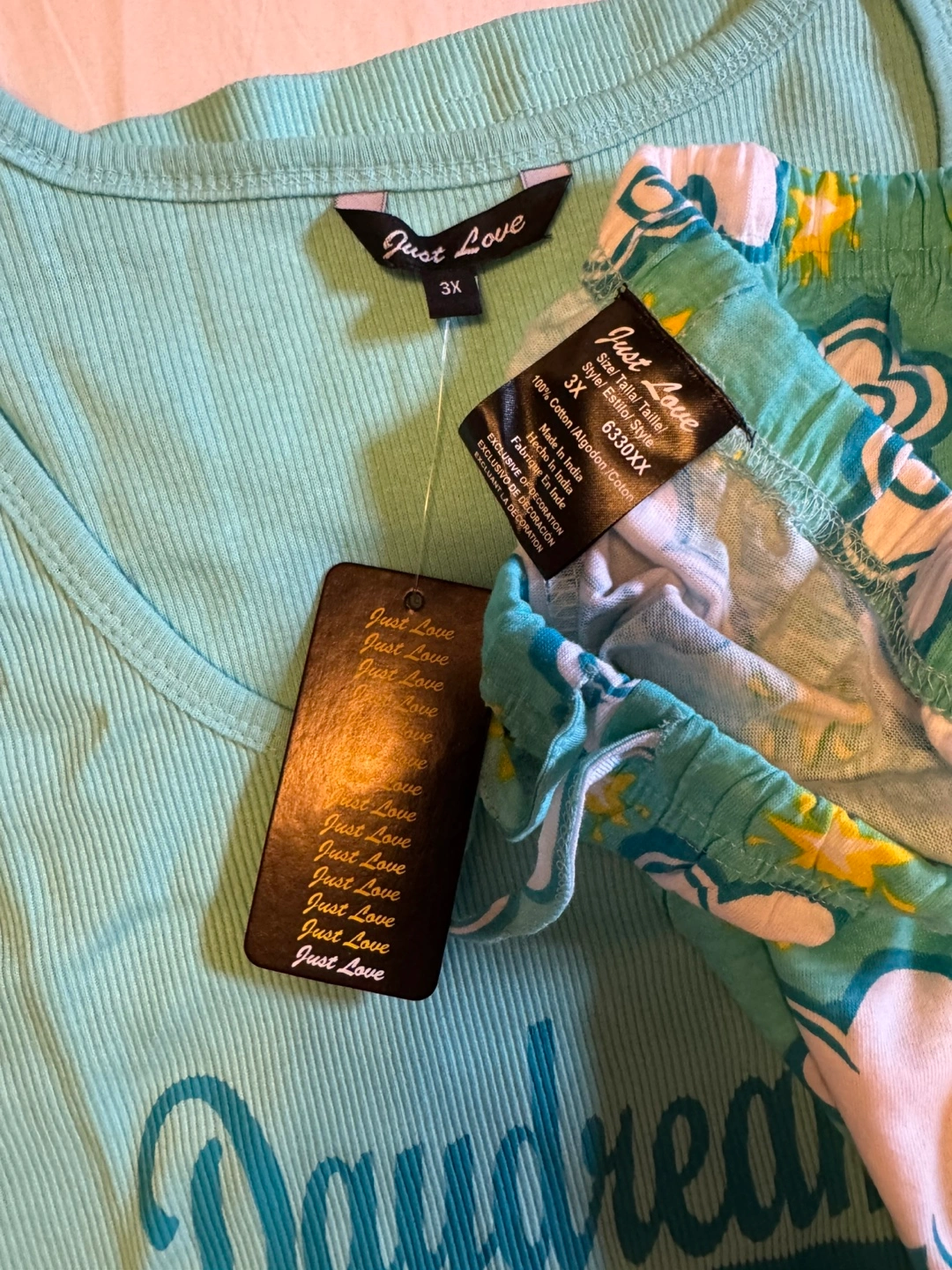 Brand New with tag. Women's pajama set. Size 3X. Blue colour. Features a ribbed tank top and pajama pants. Cloud and star print on pants. 'Daydreamer' graphic on top. 100% cotton.