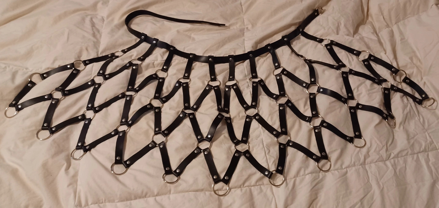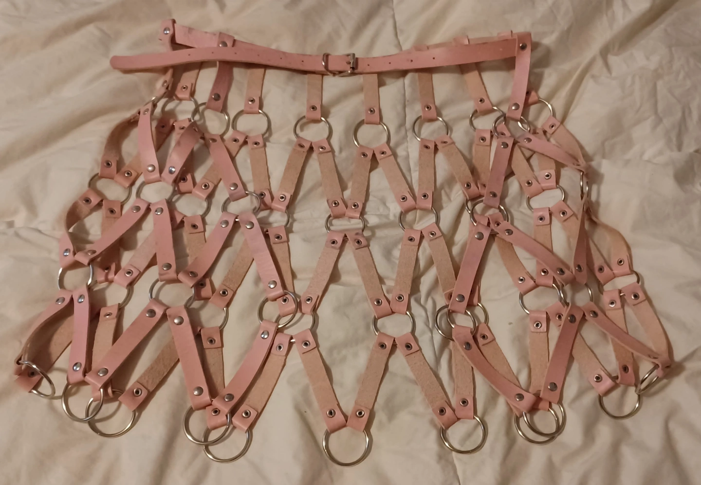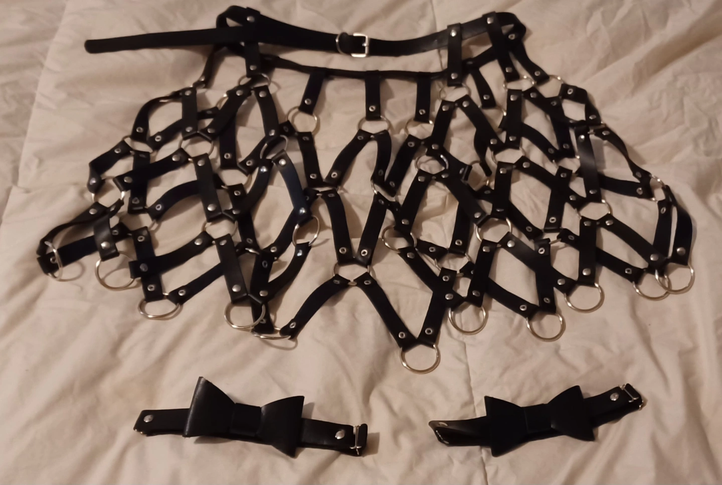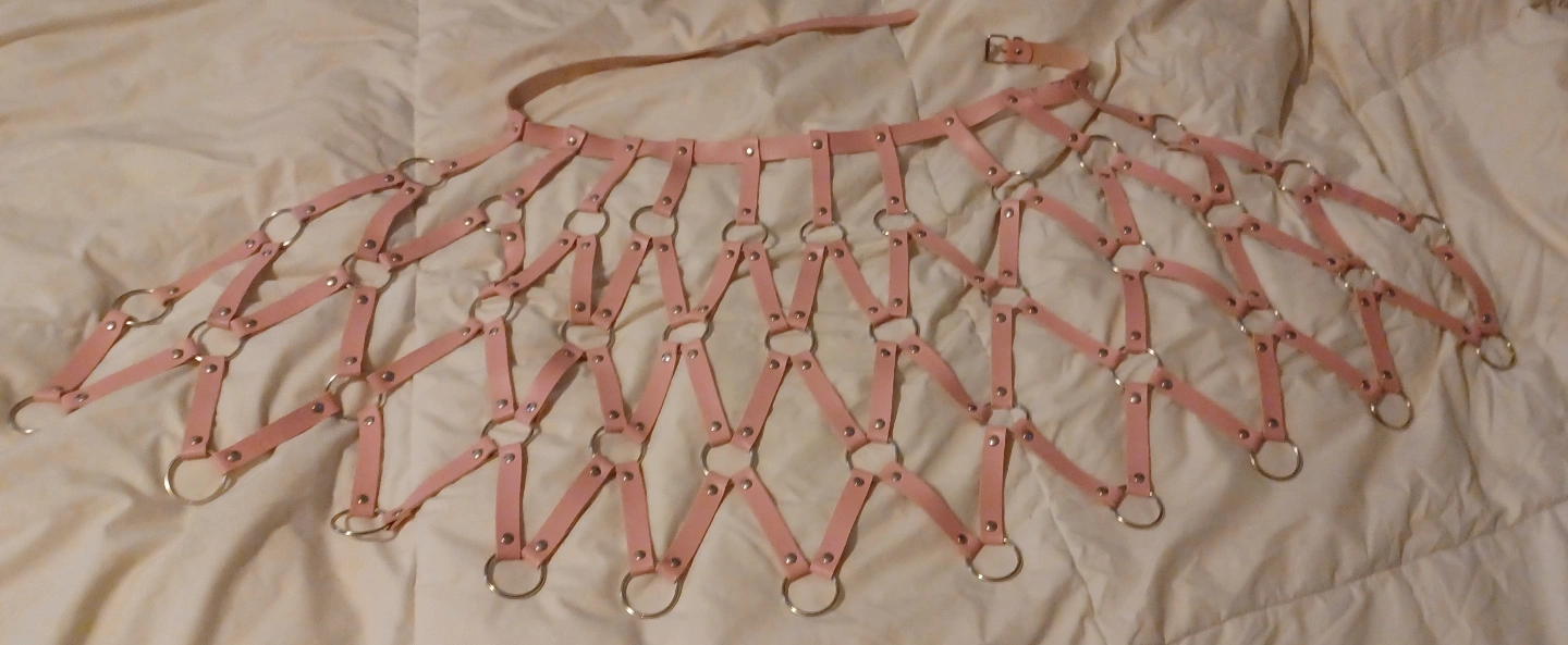 Unique vegan-leather harness set. Includes a skirt and a top. Features metal rings and studs. Pink and black colours available for the skirt, top only comes in black with two bowtie elastic band garters. Adjustable straps. Can sell pieces separately.