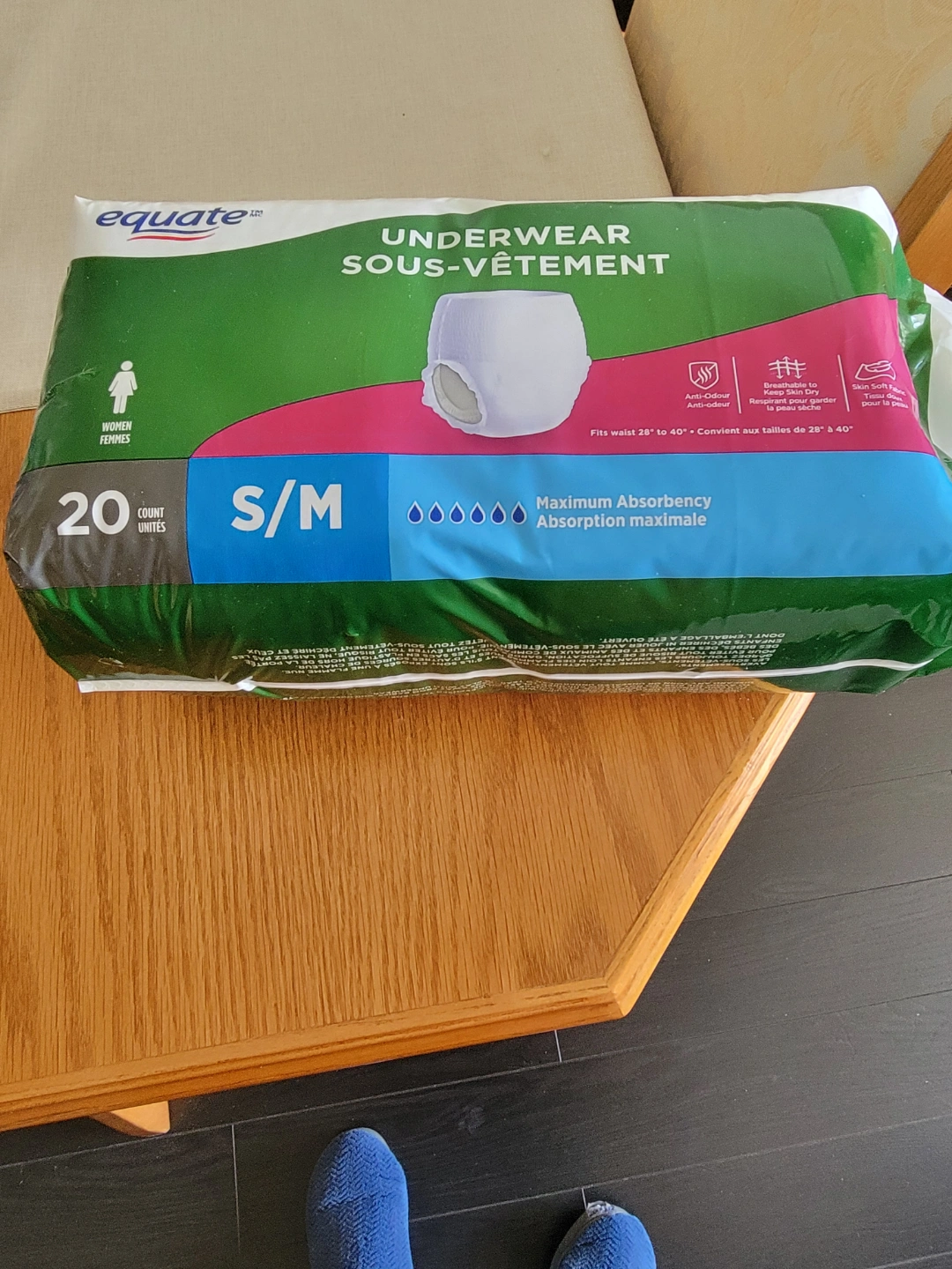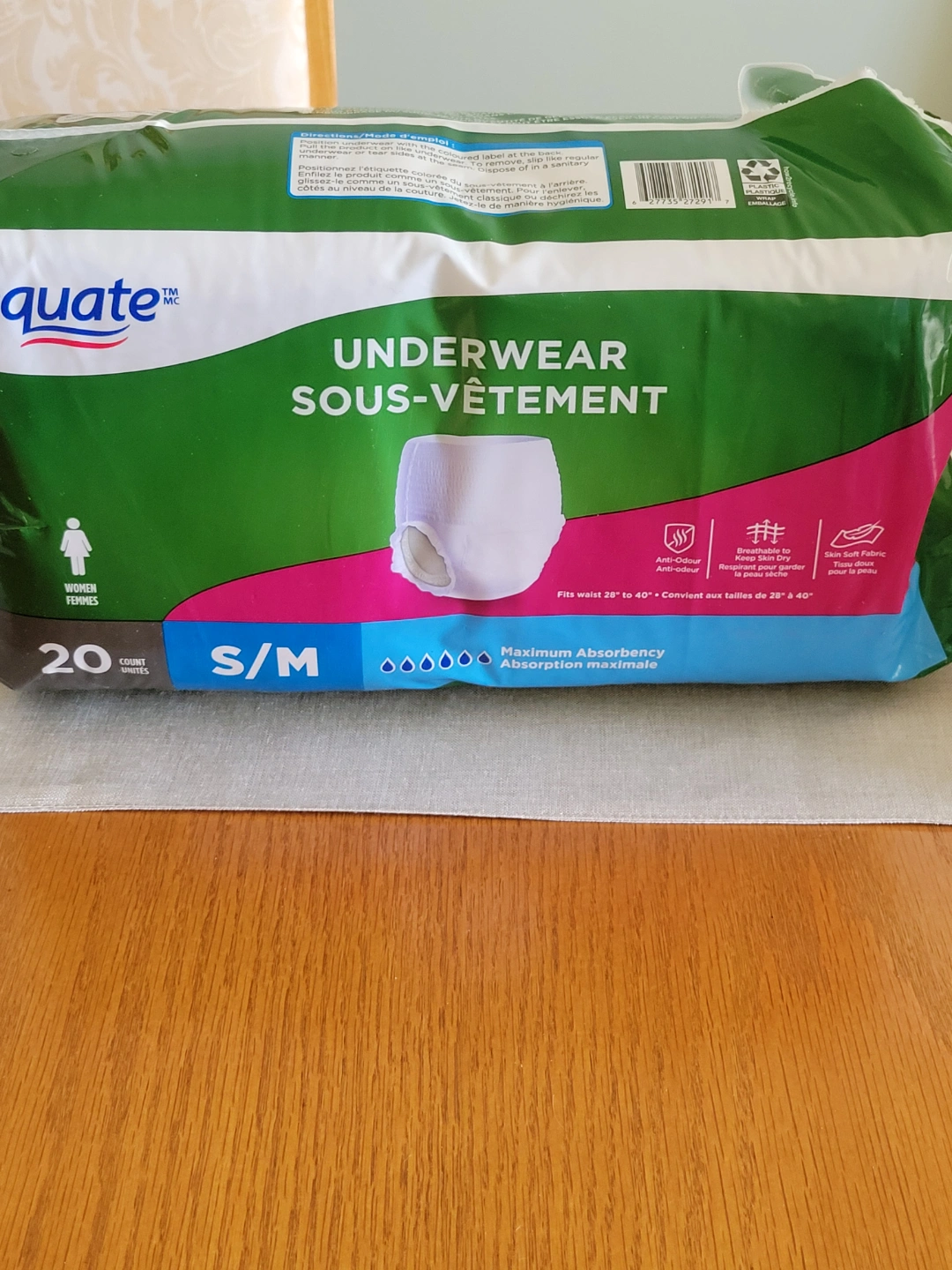 New, opened package, one was taken out to try on. Women's underwear, size small/medium. Maximum absorbency. Fits waist 28"-40". 20 count.