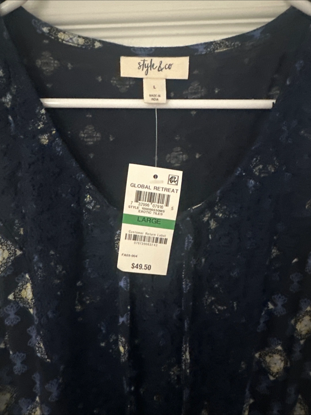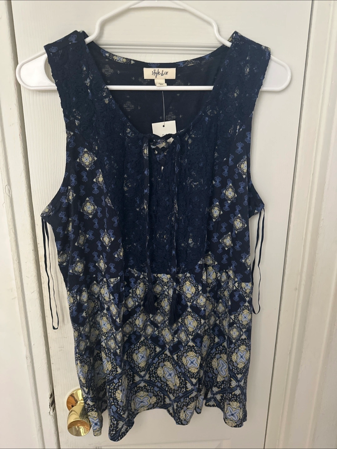 Navy blue sleeveless top. Lace detailing. Geometric print
