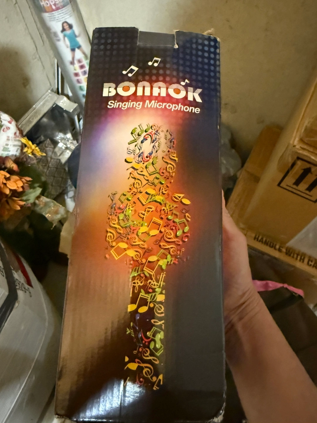New BONAOK singing microphone. Includes USB, music playback, volume control, and microphone functions. Made in China.