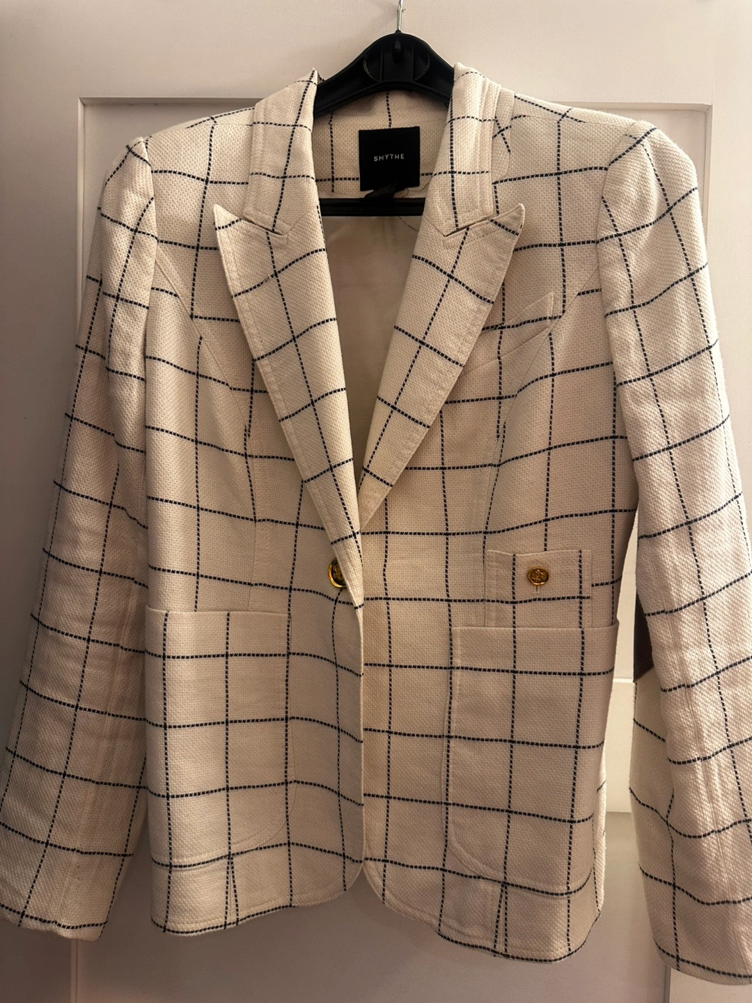Jacket is cream with navy blue check, brown elbow pads. Worn a handful of times, in great condition!
