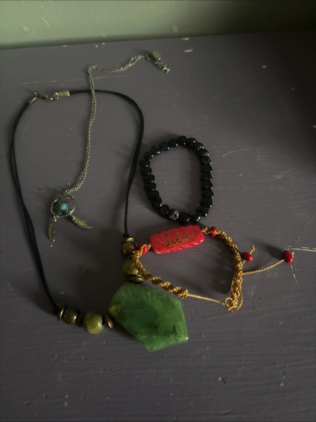 Two necklaces and two bracelets. One necklace features a turquoise pendant. Another necklace has a large green stone. One bracelet is black, the other has red and gold accents. All are in good condition.