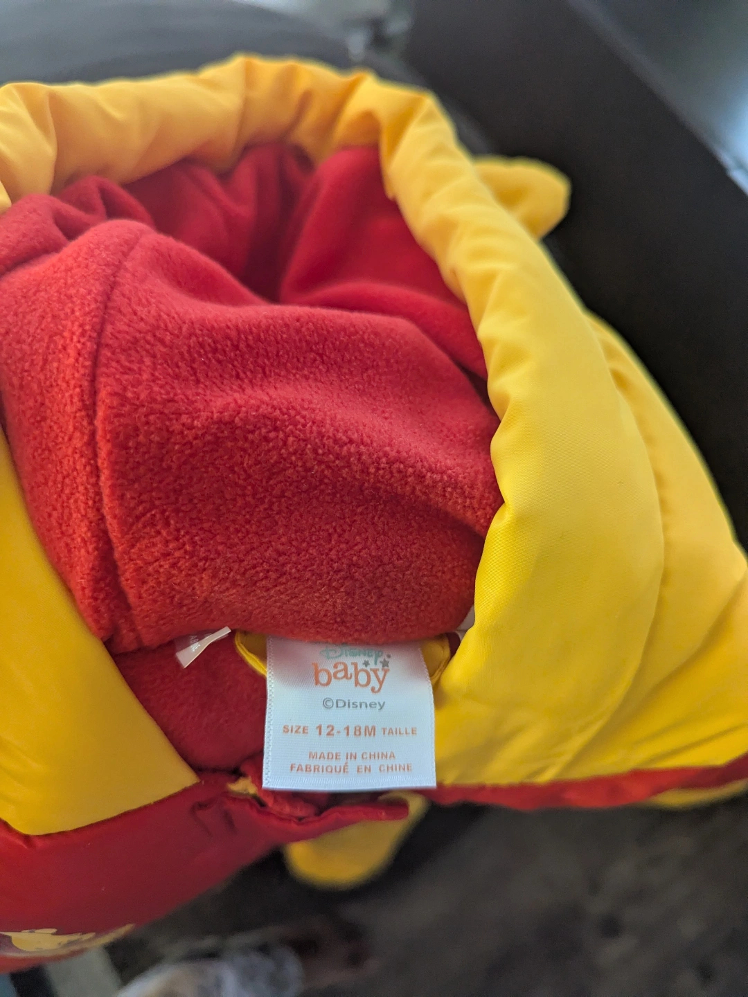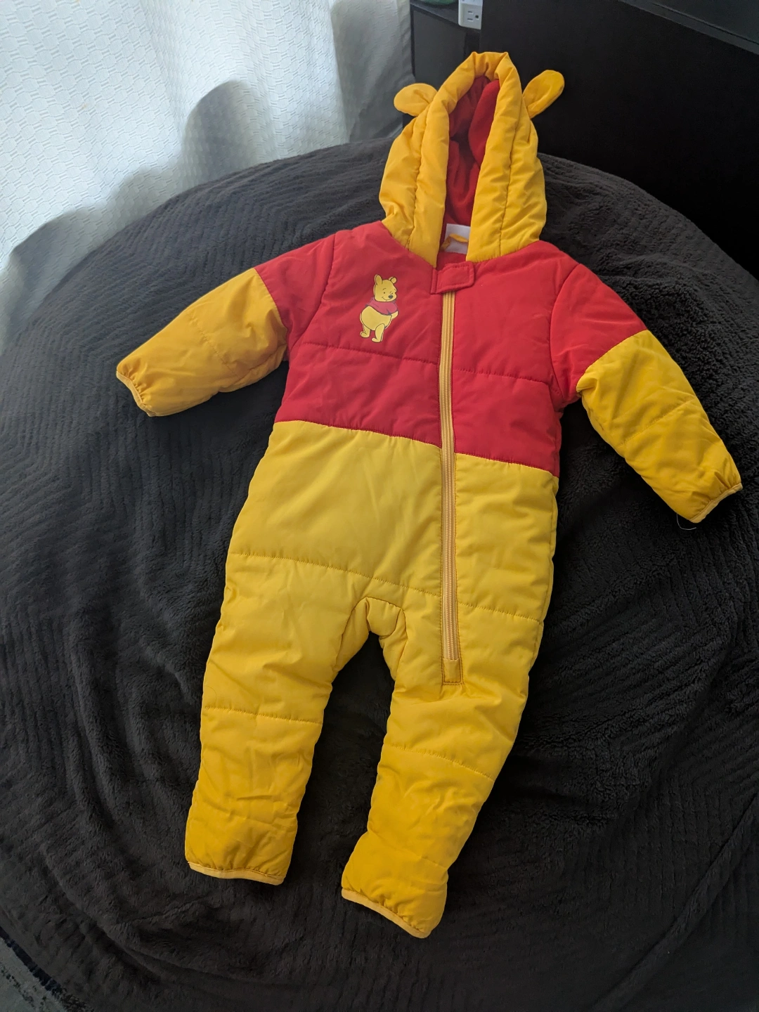 38Adorable Winnie the Pooh snowsuit. Red and yellow. Size 12-18 months. Zipper closure. Hood with bear ears. Perfect for keeping your little one warm during the winter months.