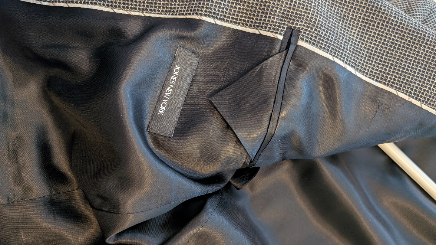 100% wool grey checkered men's Jones New York blazer. Three-button closure with a subtle pattern. Fully lined. Please check images for official sizing and details.