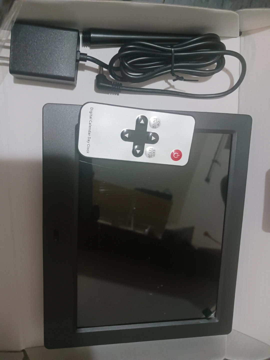 Digital calendar day clock. Includes remote control and power adapter. Large display. User manual included. New, unused.
