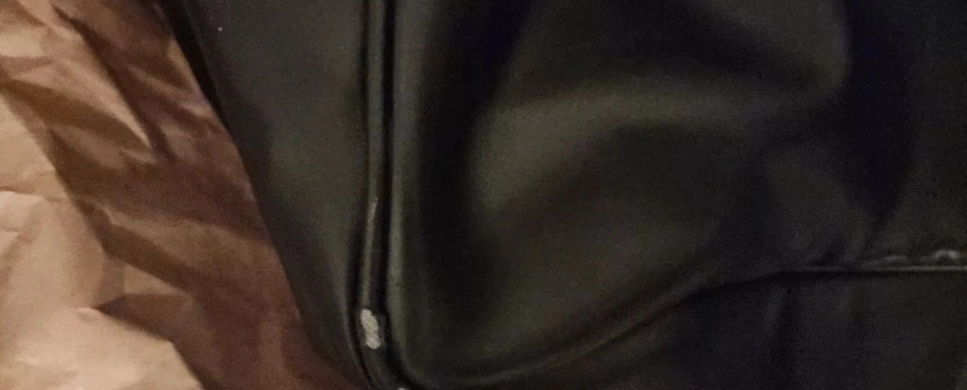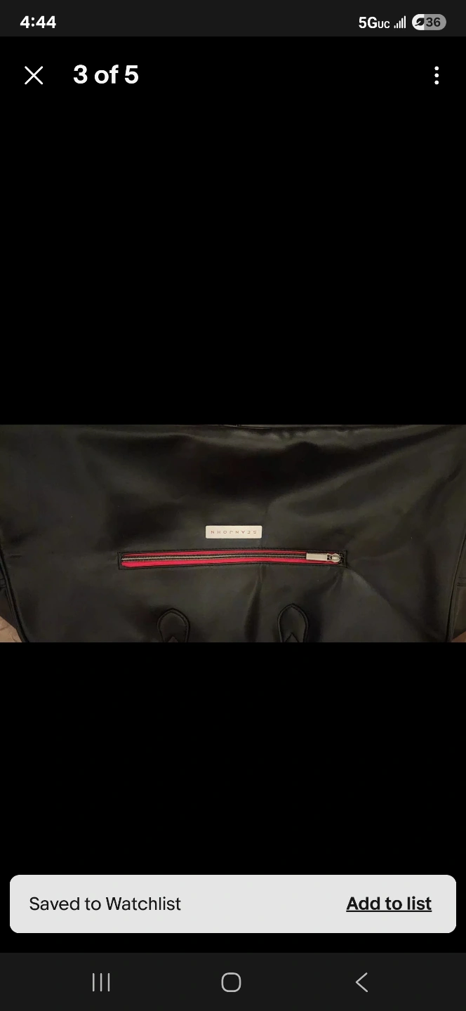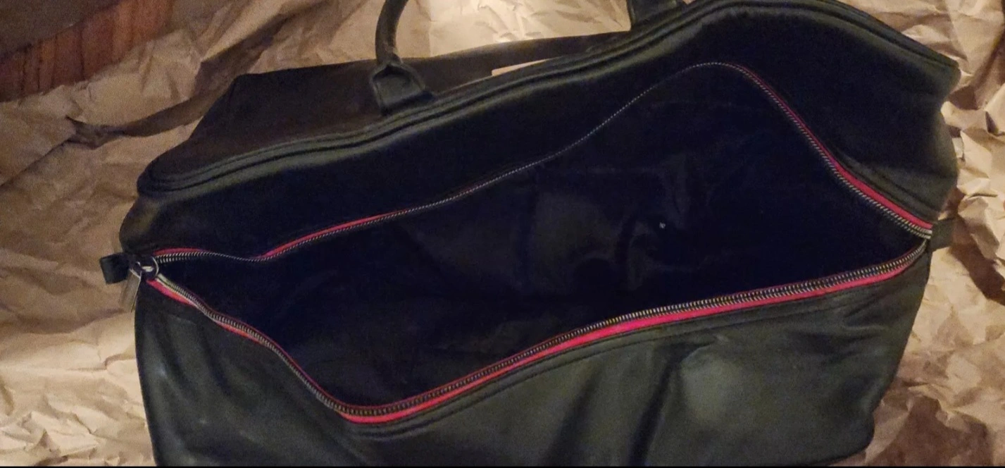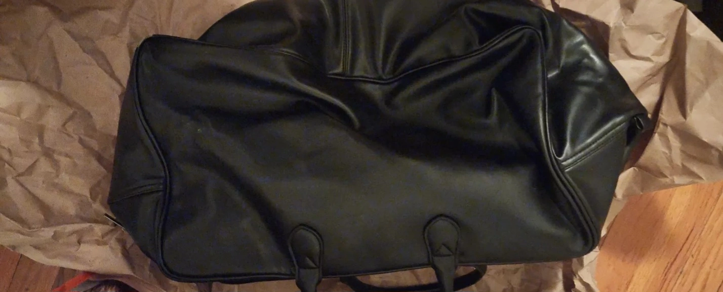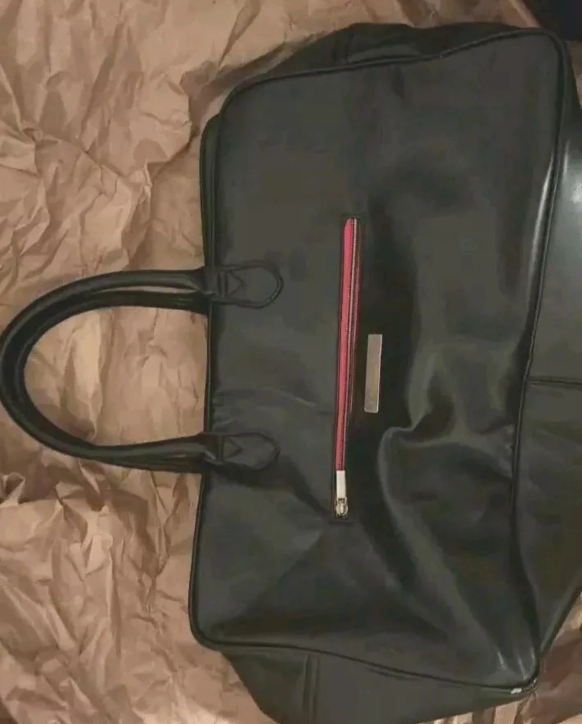hi im selling a used Large black leather weekender bag. Two top handles. Zipper closure. Red zipper accents. Great for the gym or travel has a small tear on edge