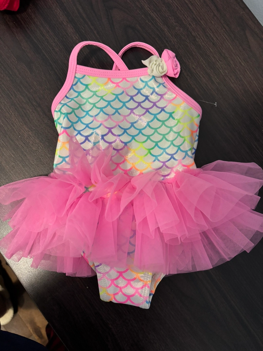 Adorable baby girl's swimsuit. Features a rainbow mermaid scale pattern, pink tulle skirt, and a cute flower detail. Size 0-3 months.