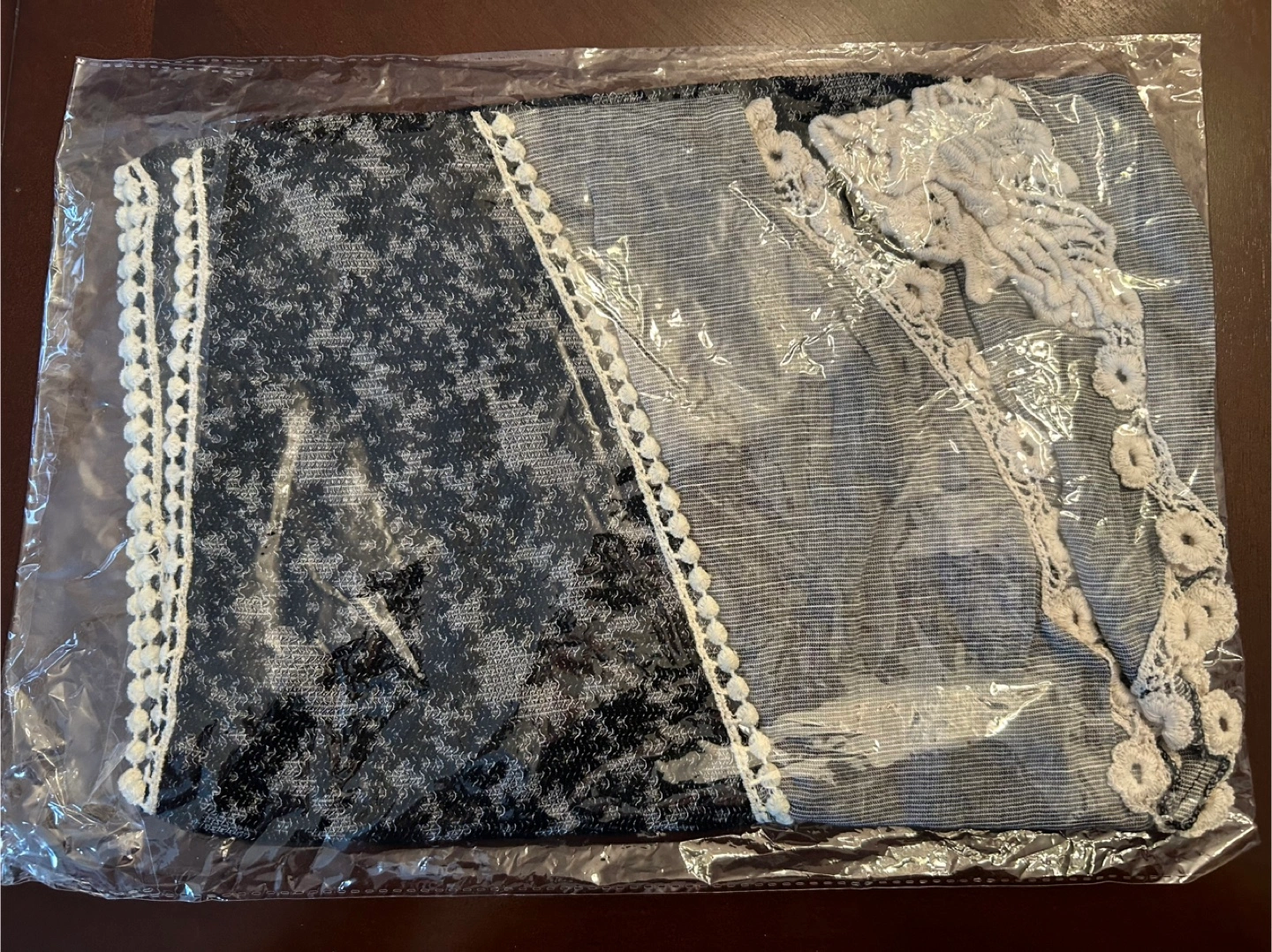 Beautiful scarf, two-toned grey and black knit with off-white crocheted lace trim. New in package. Lightweight perfect for summer.
