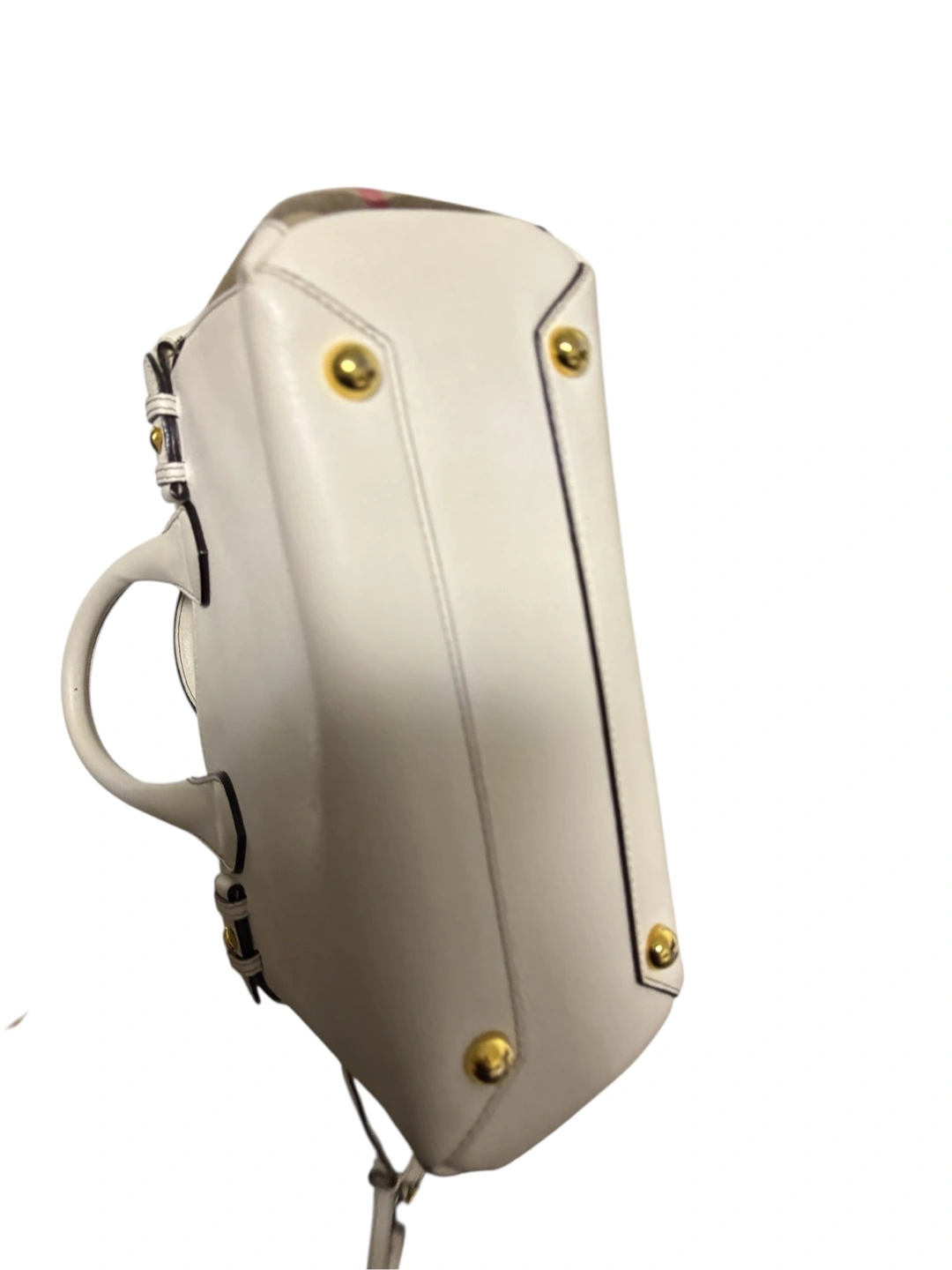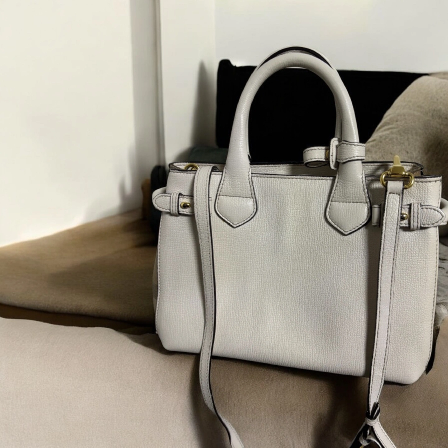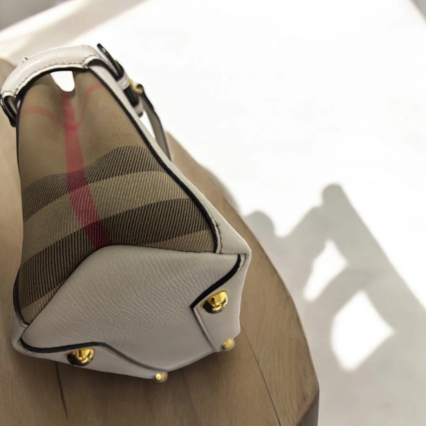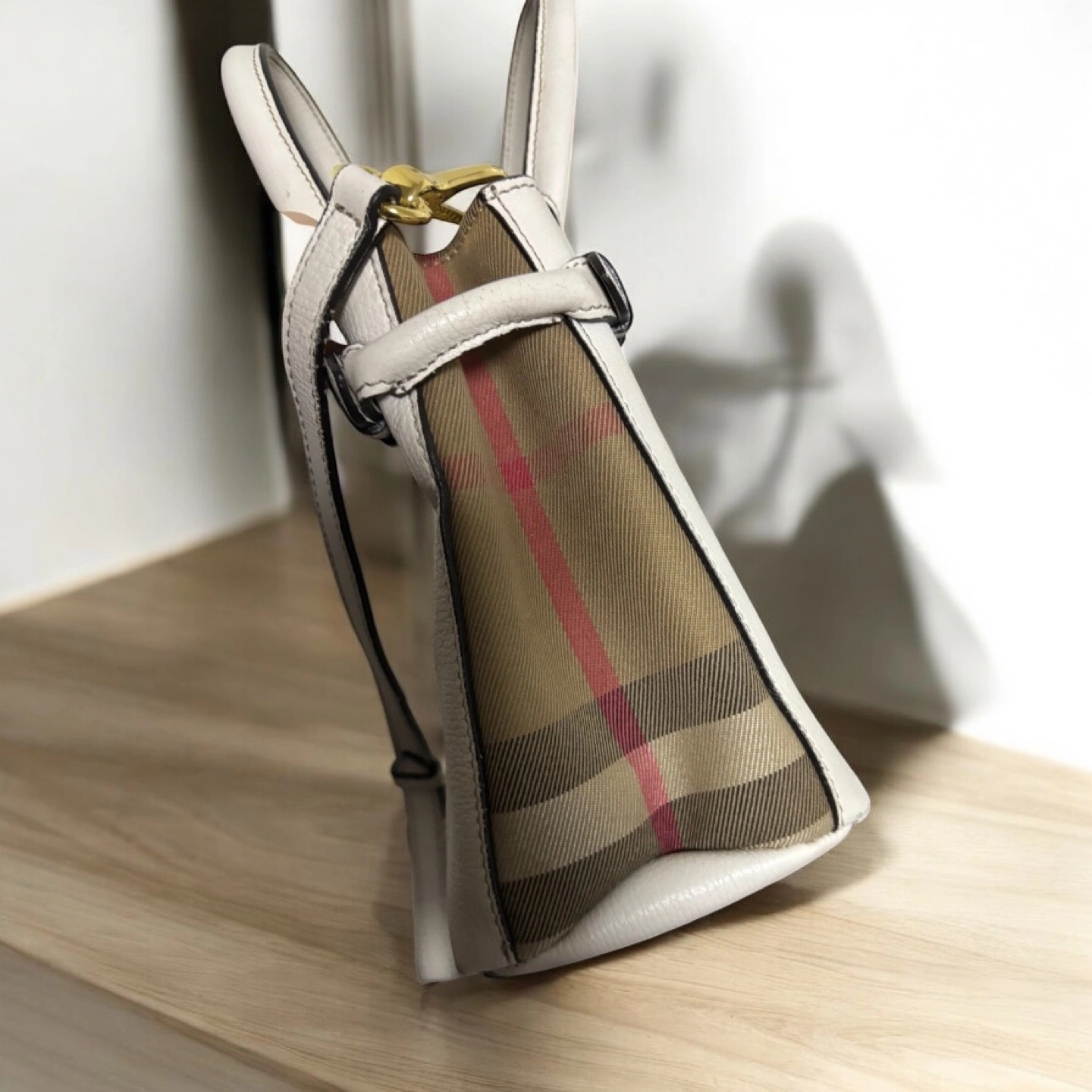 886✅ Details: • 100% authentic • Color: Off-white / Cream with Burberry check • Material: Grained leather and cotton canvas • Interior: Clean and spacious, zip & slip pockets • Closure: Magnetic snap • Approx. measurements: 10” W x 8” H x 5” D • Strap drop: Top handles 4”; Adjustable crossbody strap up to 21” ⸻ 💬 Condition Notes: In very good pre-loved condition. Minor signs of gentle wear on the corners and hardware. Clean interior. All photos are of the actual item taken in natural lighting.