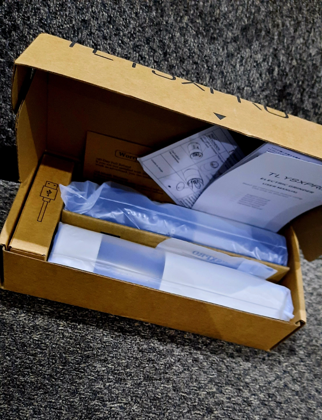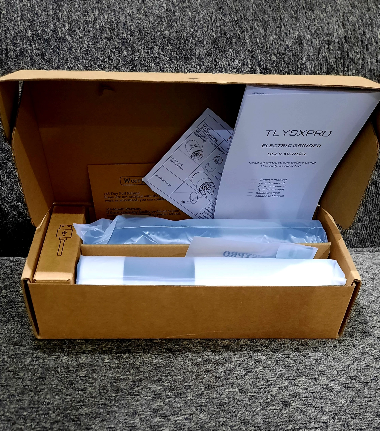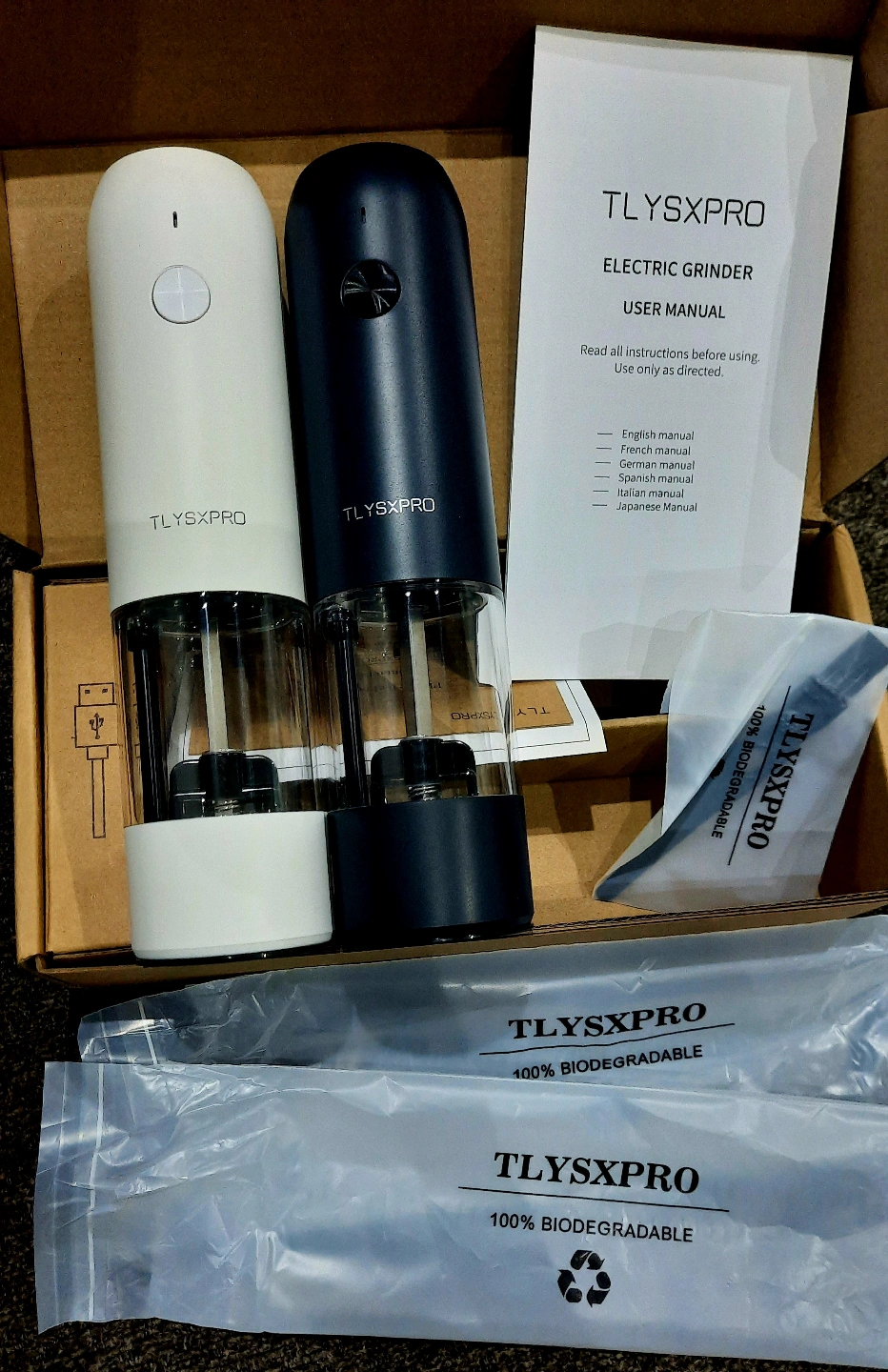 Brand new, unopened box. Includes two electric grinders, one white and one black. USB charging cable included. User manual in multiple languages. 100% biodegradable packaging.