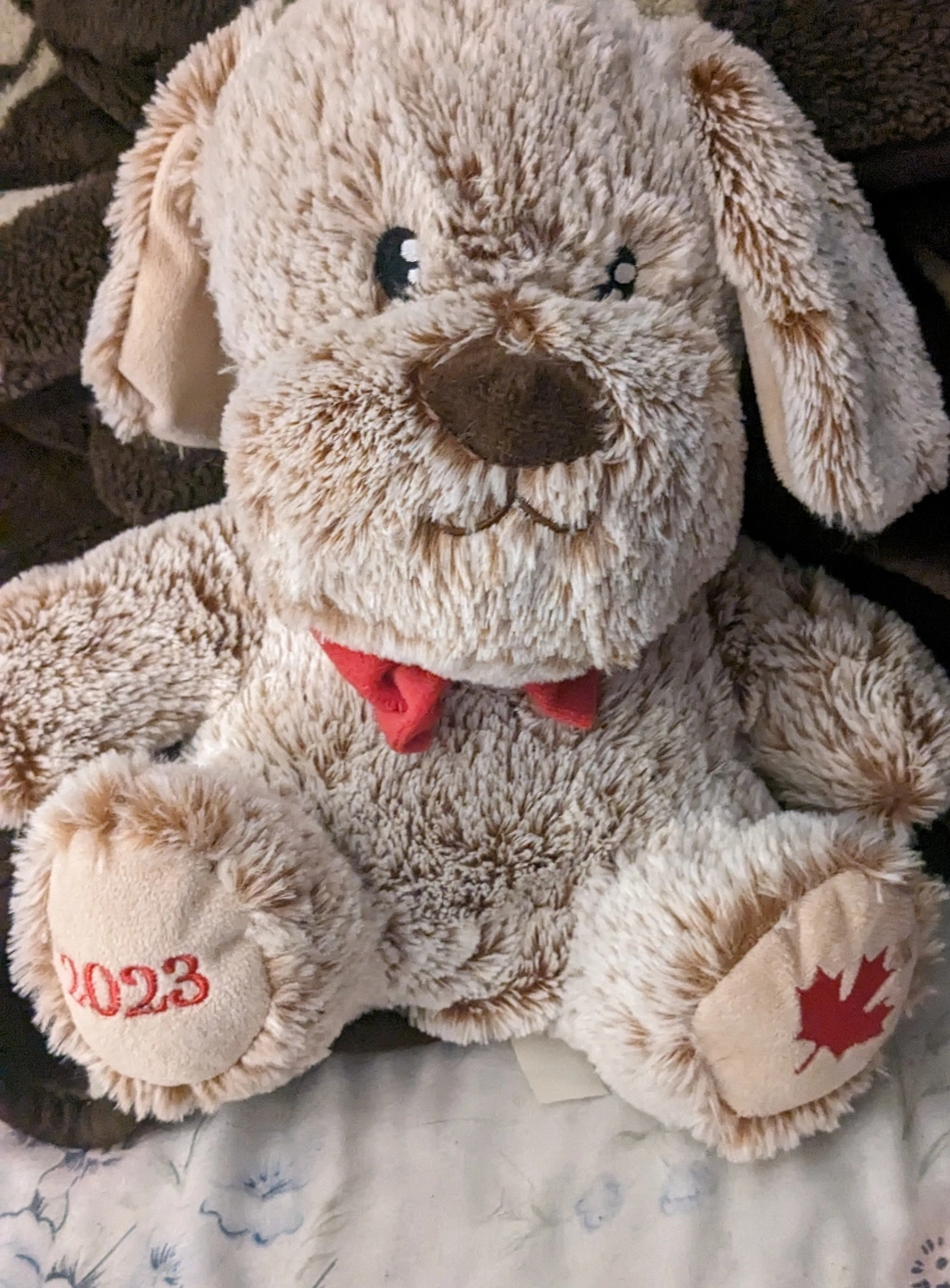 Adorable plush puppy, light brown and cream coloured fur. Features a small red bow tie. One paw embroidered with '2023', the other with a Canadian maple leaf. Perfect gift or collectible.