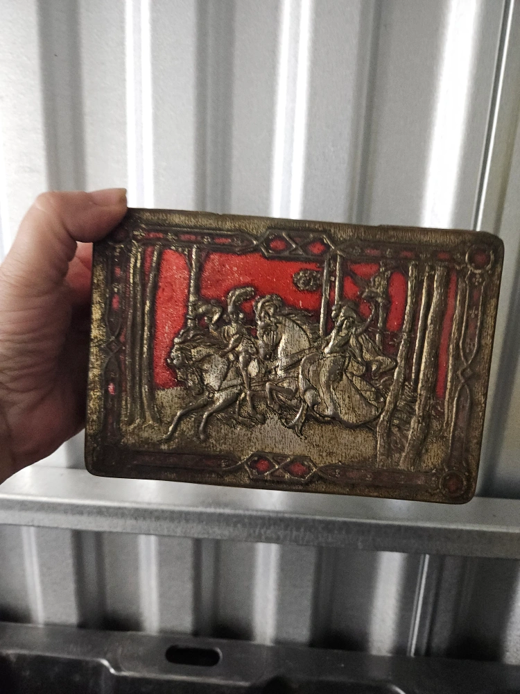 The item is a vintage Riley's Toffee tin, likely from the mid-20th century, featuring an embossed design of a hunting scene with riders on horseback. Riley's Toffee was a popular British confectionery brand.