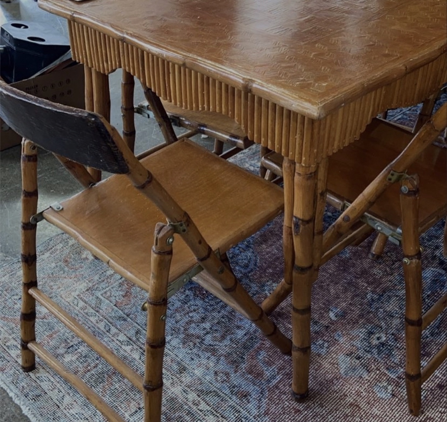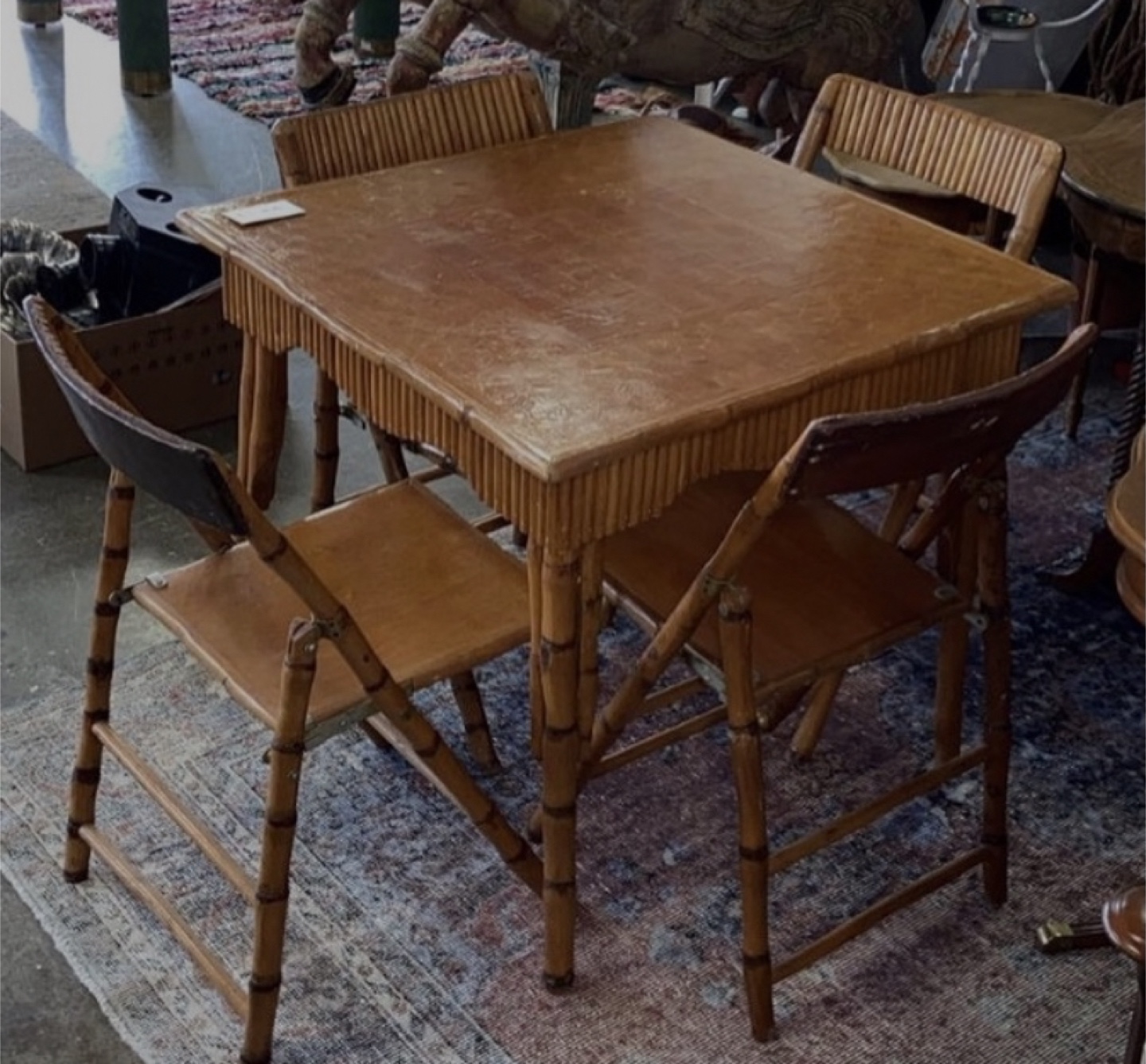 Unique vintage bamboo folding table with four matching chairs. Ideal for small spaces or patios. Tabletop shows some wear. Excellent conversation piece. Good for Mahj! PAID $550
