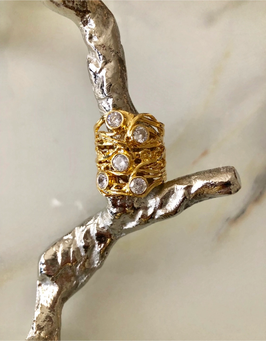 Unique 14 kt gold plated over sterling ring. Features a textured band and several diamond weight equivalent clear cubics stones. Stunning and one of a kind. Very comfortable.