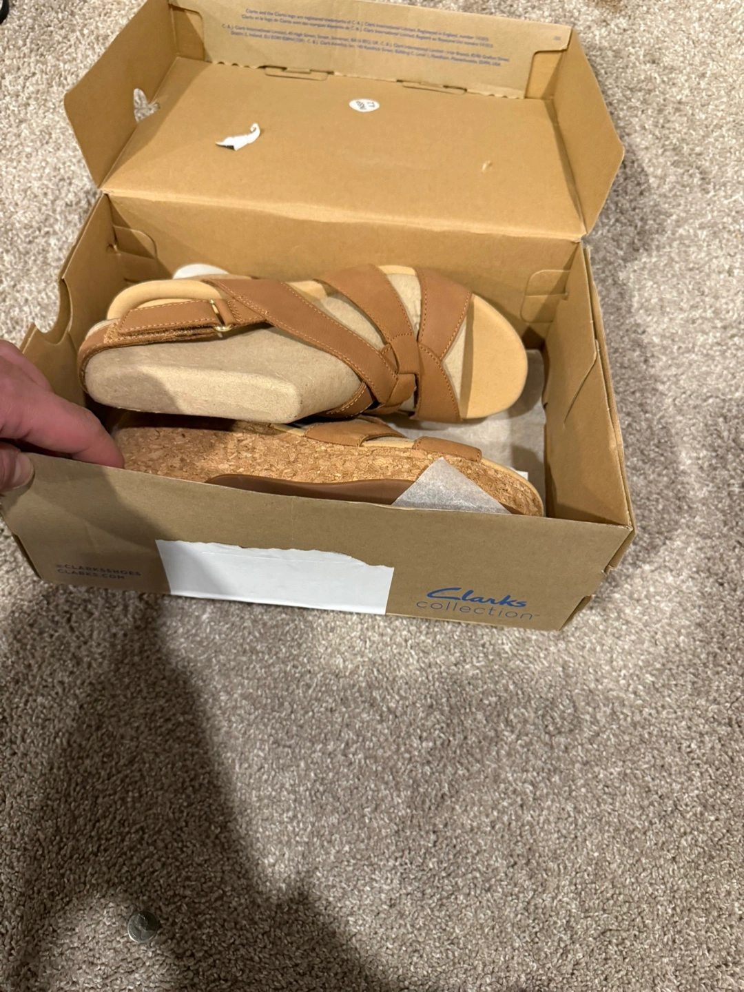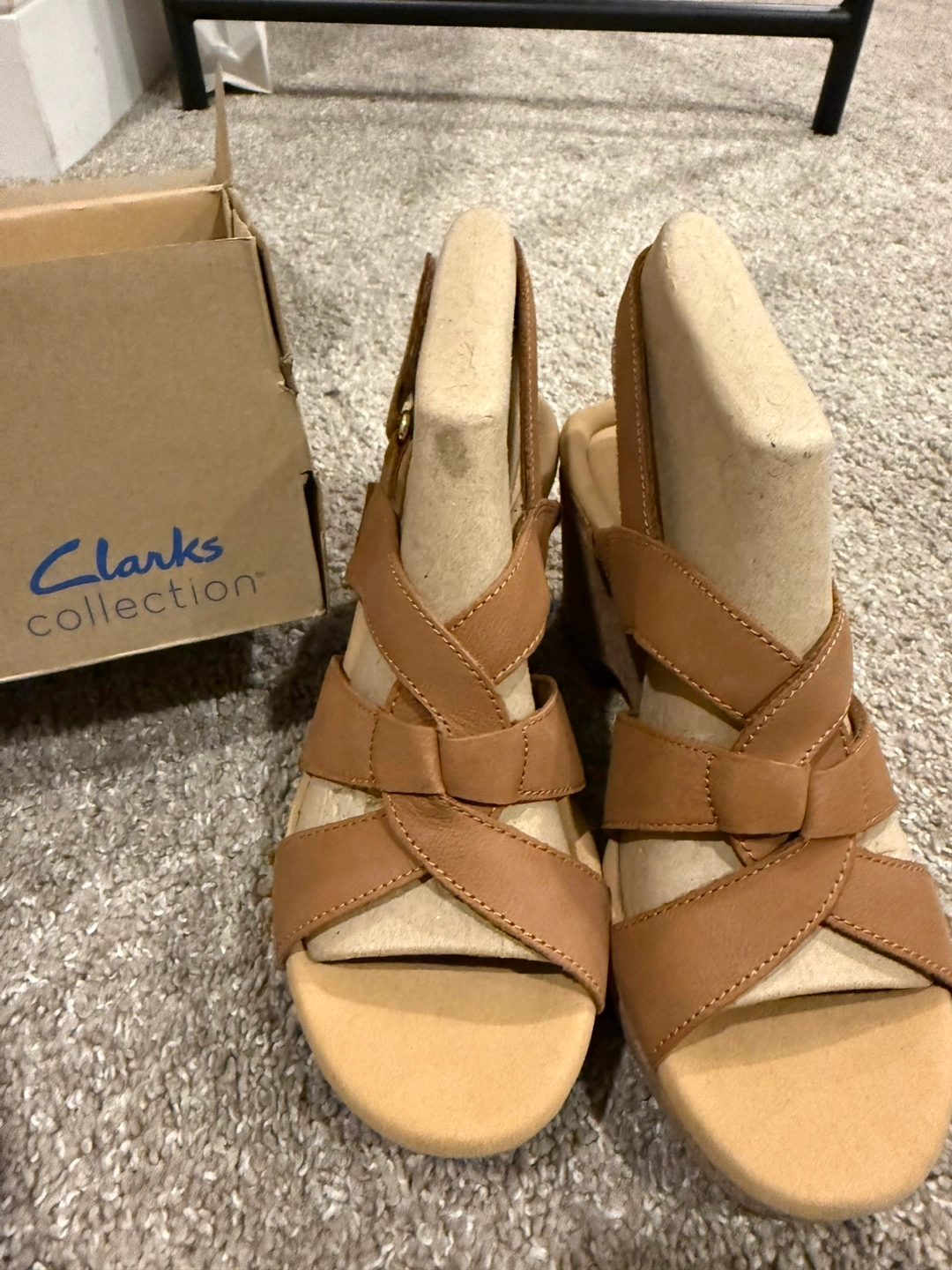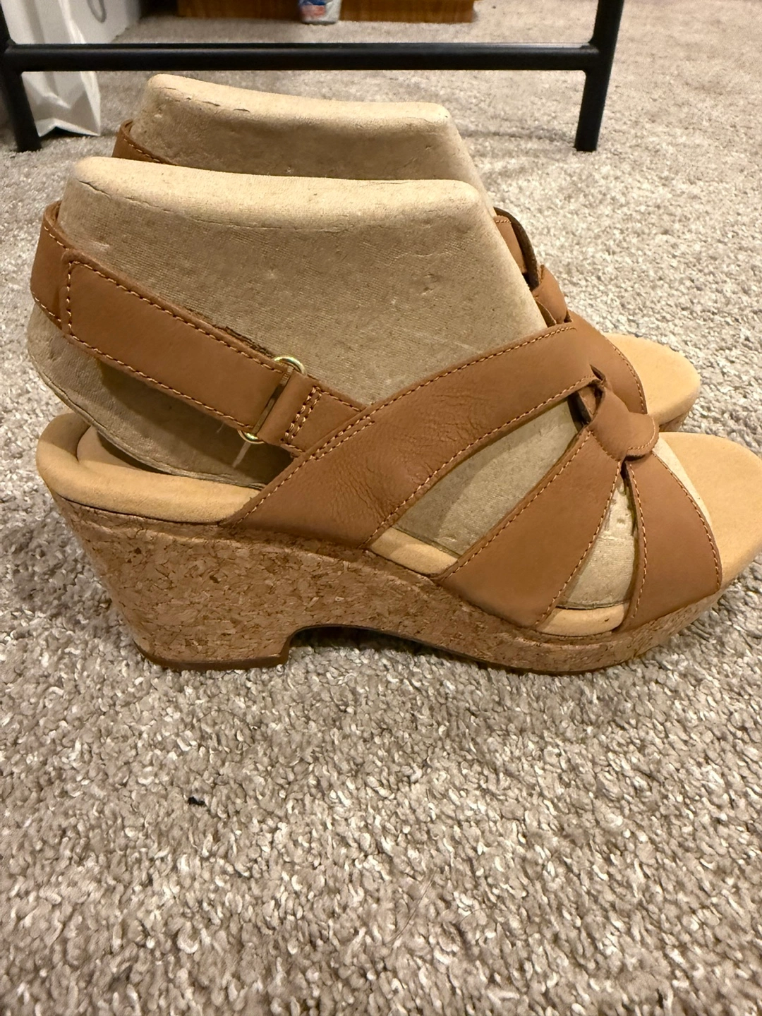 18Lightly worn, women's tan leather wedge sandals. Cork wedge heel. Leather straps. Open toe. Comfortable and stylish.