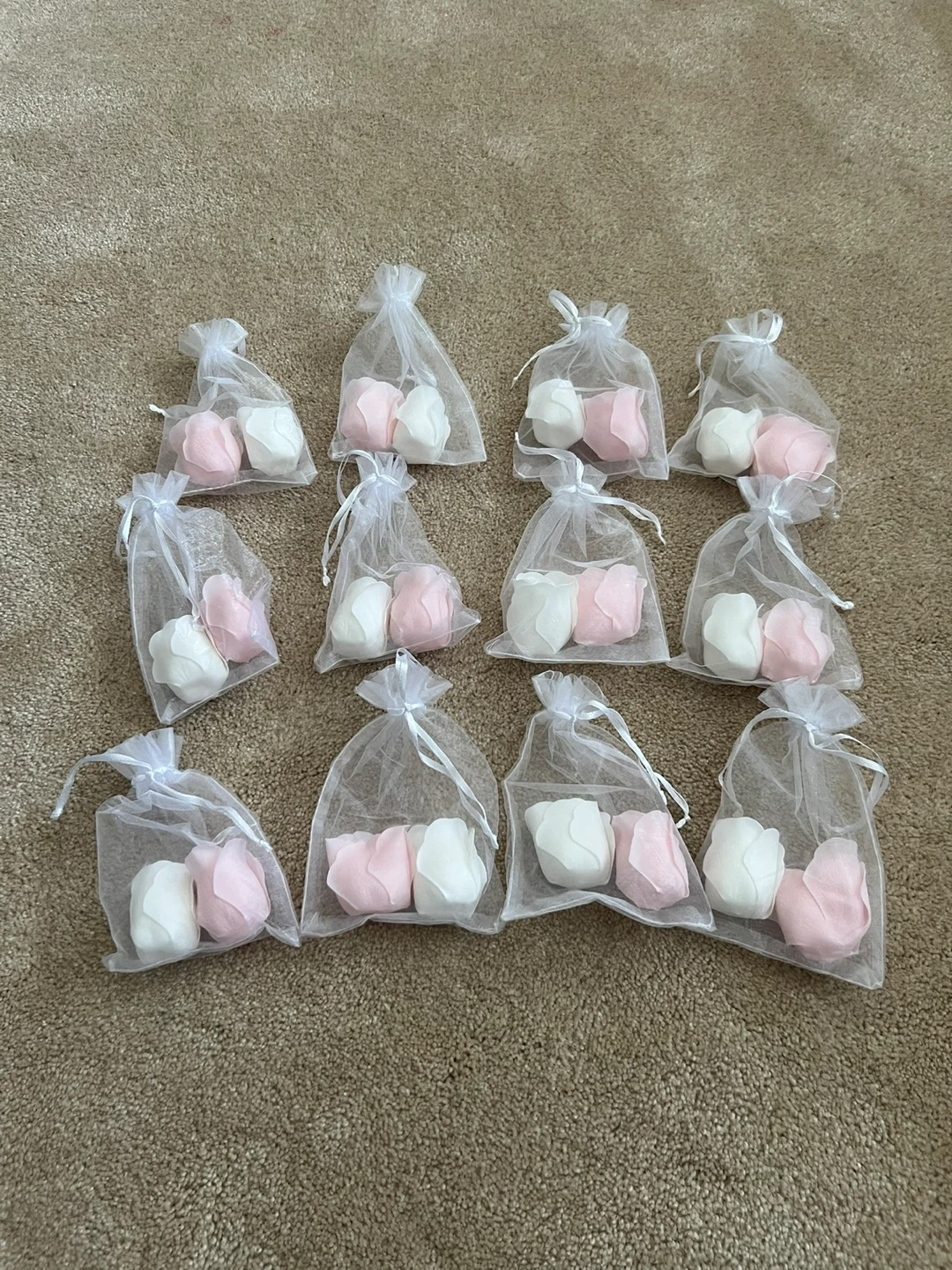 24 wedding favours (pink & white soap roses in white mesh bag)