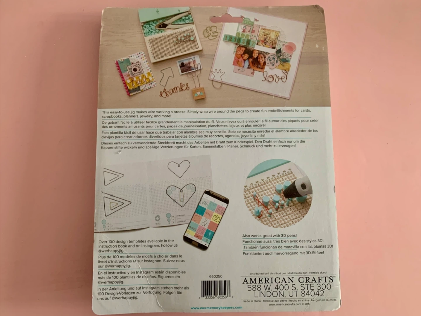 This We R Memory Keepers Happy Jig set includes a wire cutter, 99 pegs, and 3 colours of wire. It's designed for creating custom wire embellishments for crafts. Over 100 design templates are available online.