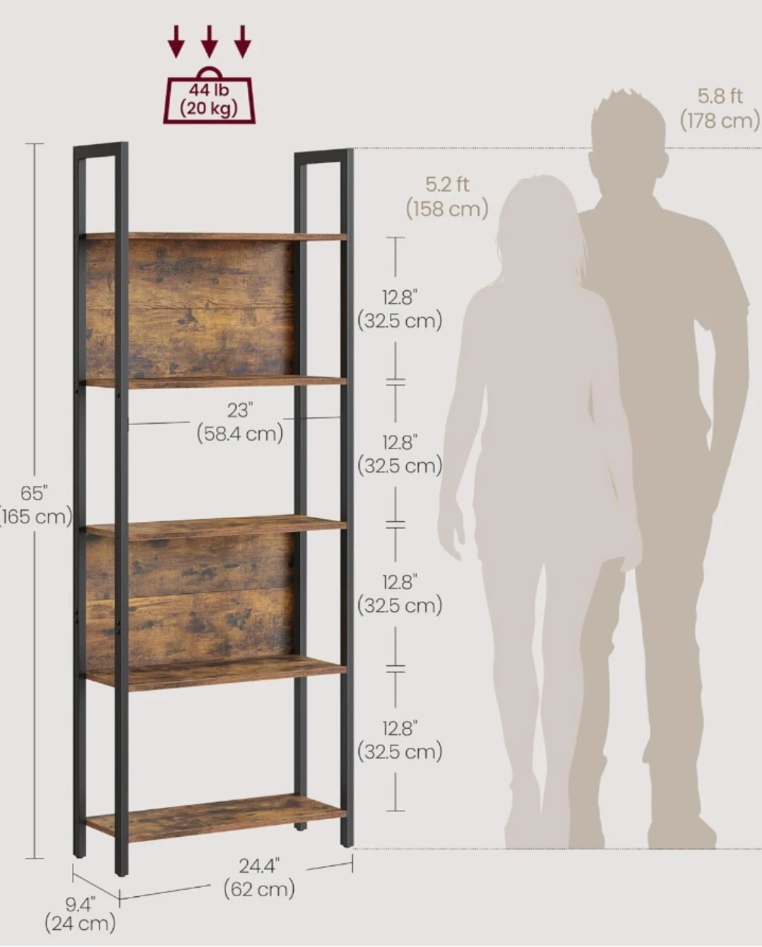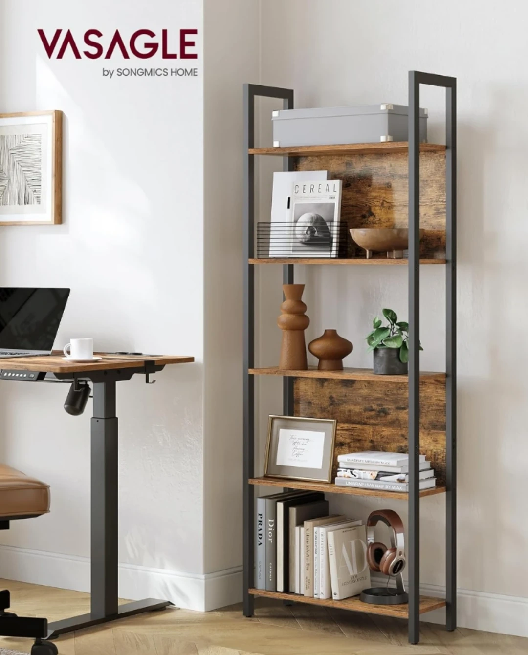 VASAGLE 5-shelf bookcase with metal frame. Features quality veneered panels, back panels to protect items, and adjustable feet for stability. Each shelf holds up to 44 lb (20 kg). Measures 65" H x 24.4" W x 9.4" D.