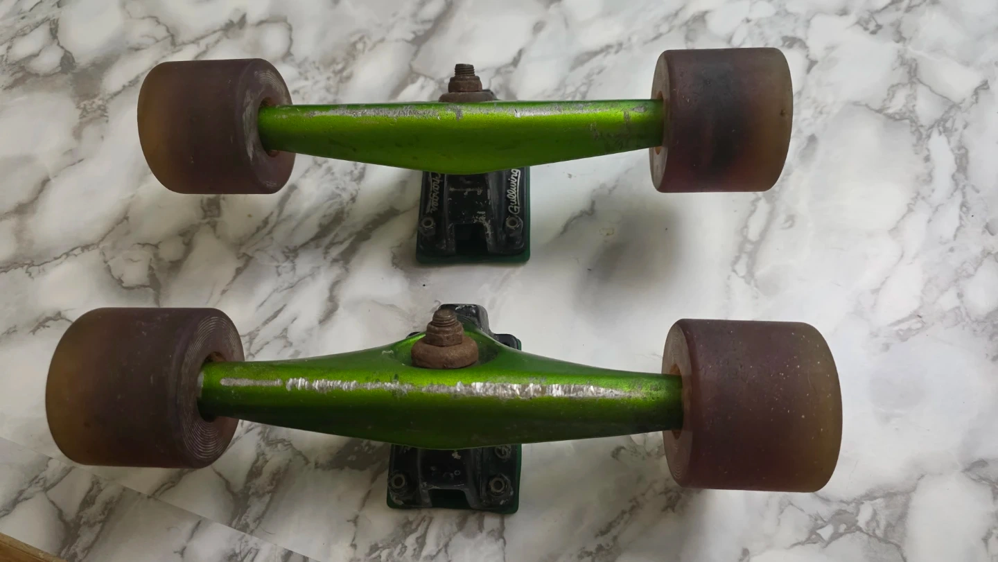 I did not use these long. bearings are old but has purple penny wheels lucky truck risers reds hard x2 bushings comes with extra hardware and skate tool like new used once or twice. Selling As a whole