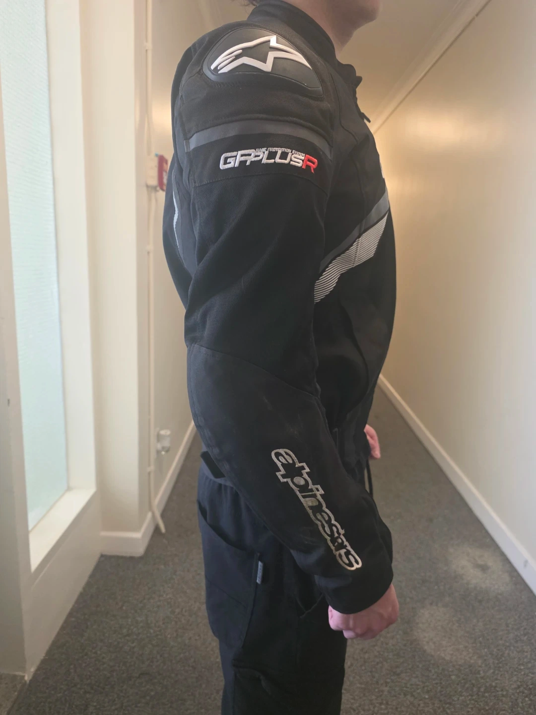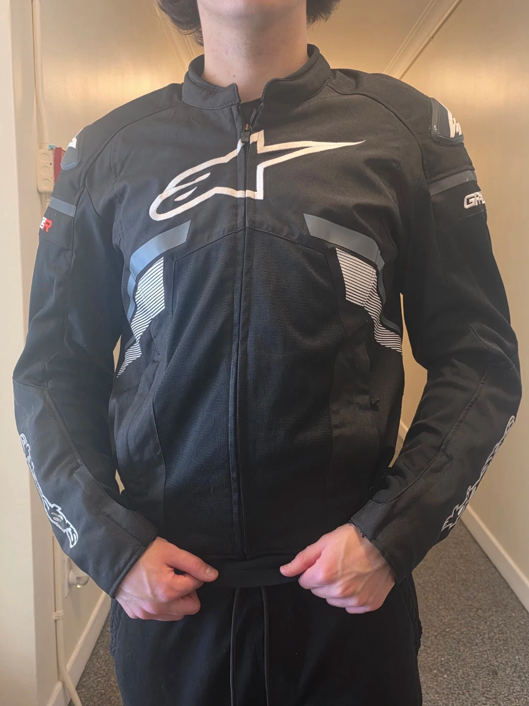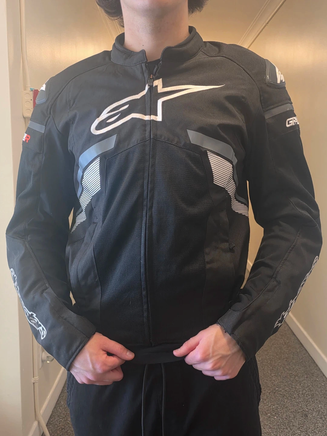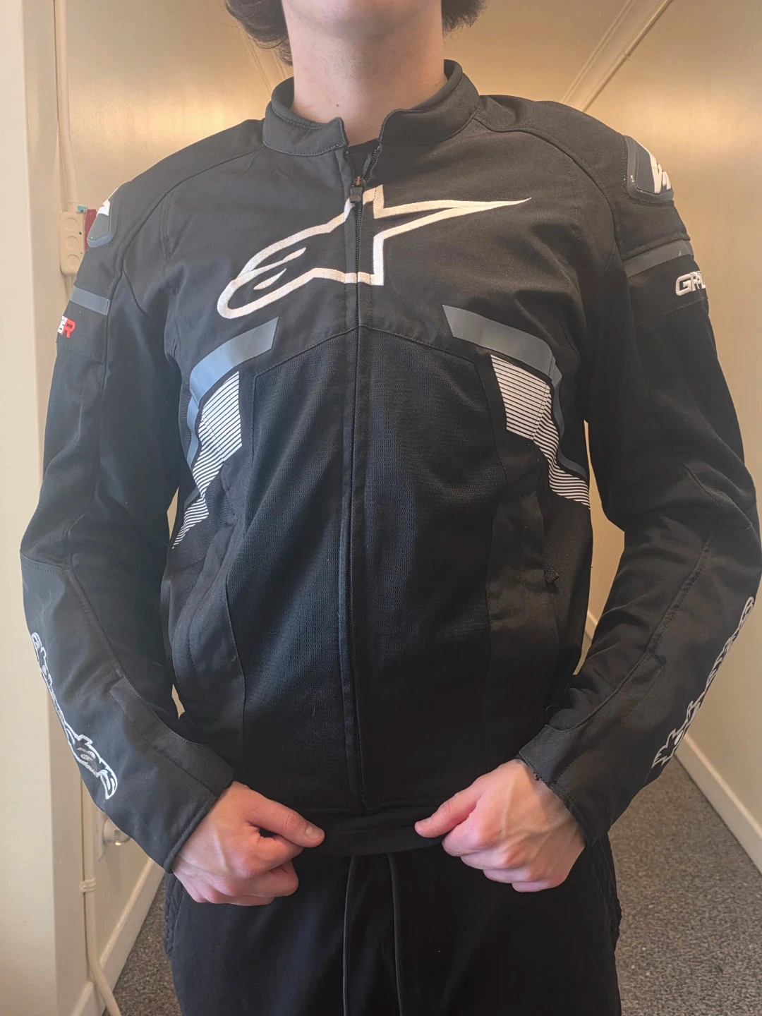 Black Alpinestars GP Plus R motorcycle jacket. It's a textile jacket with reflective detailing. This jacket is designed for riding.size large Italian, fits like a usa s, or m