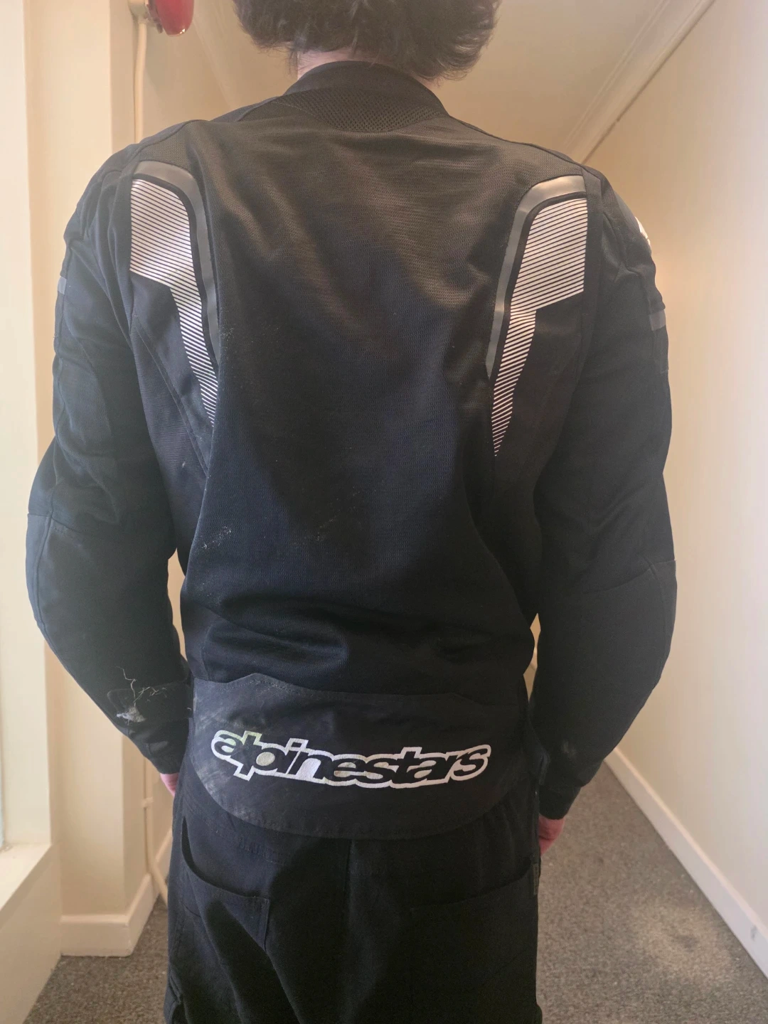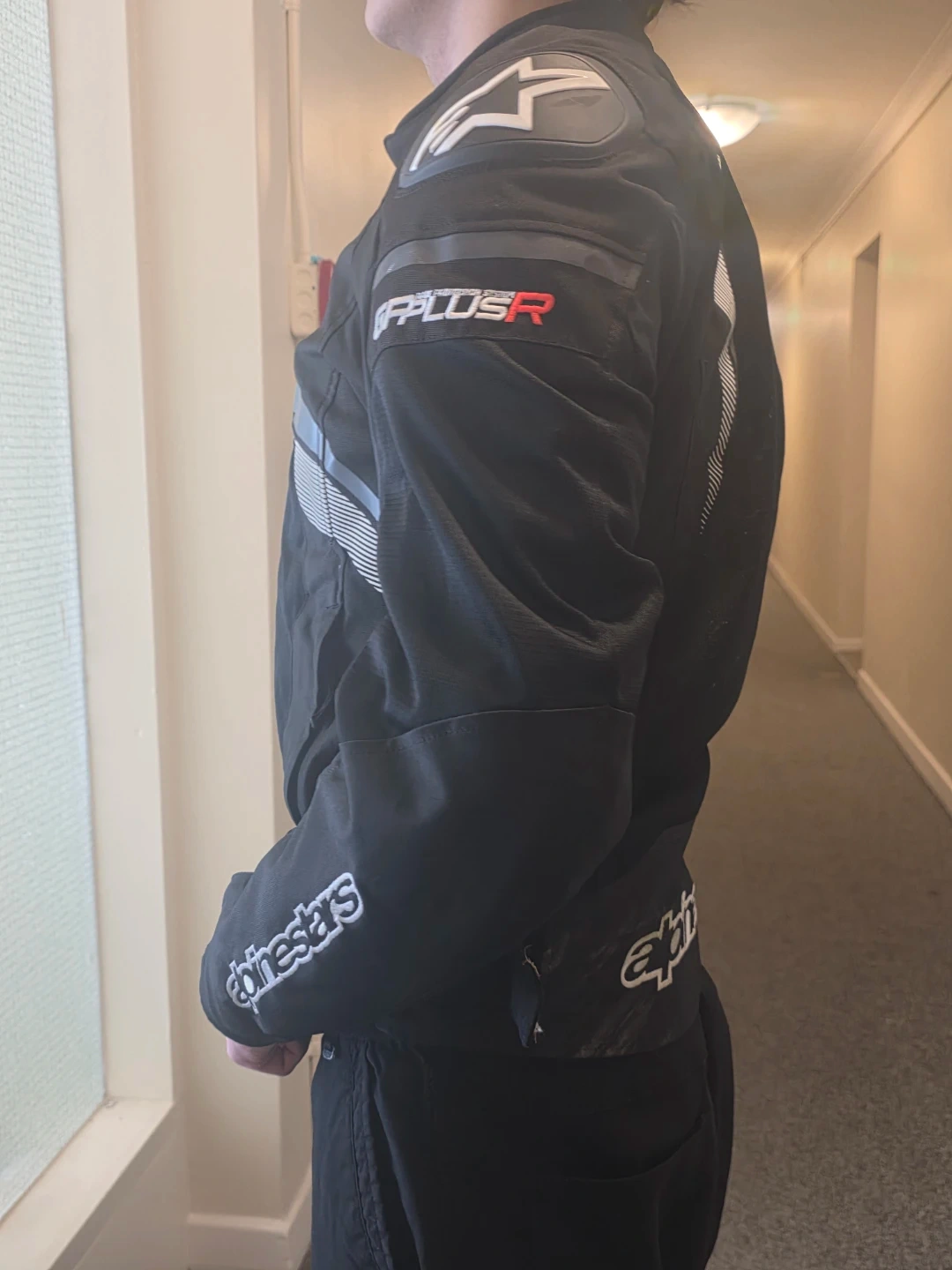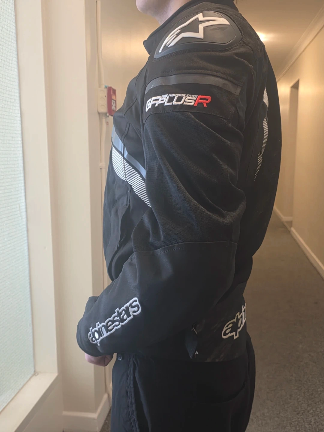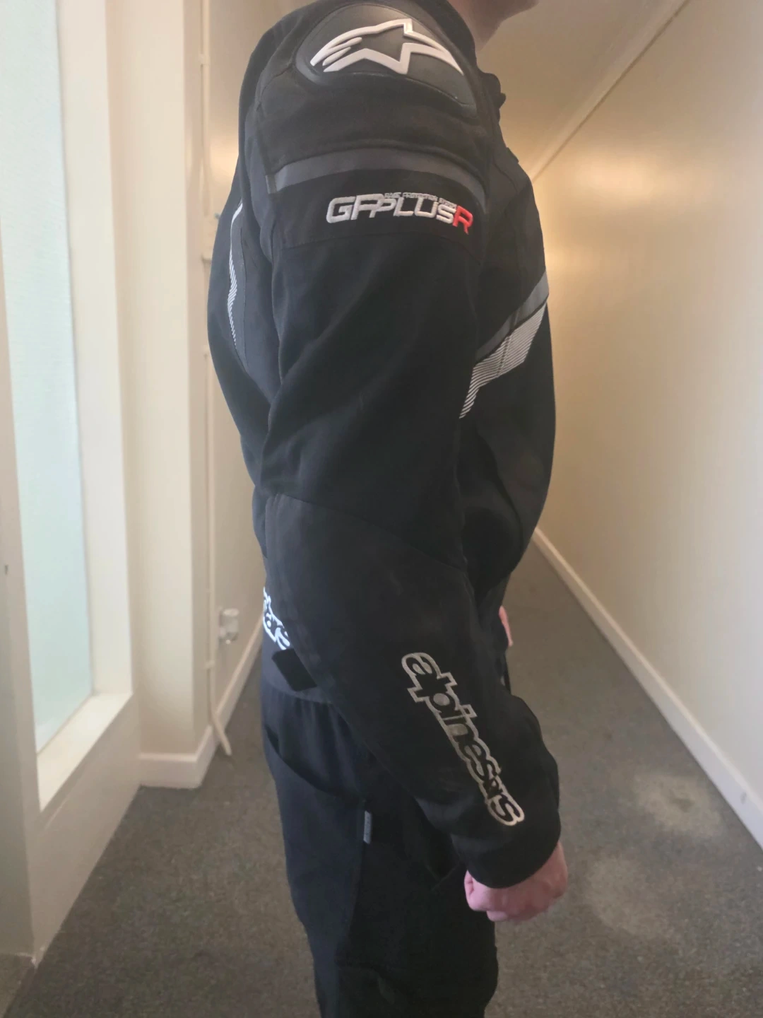 Black Alpinestars GP Plus R motorcycle jacket. It's a textile jacket with reflective detailing. This jacket is designed for riding.size large Italian, fits like a usa s, or m