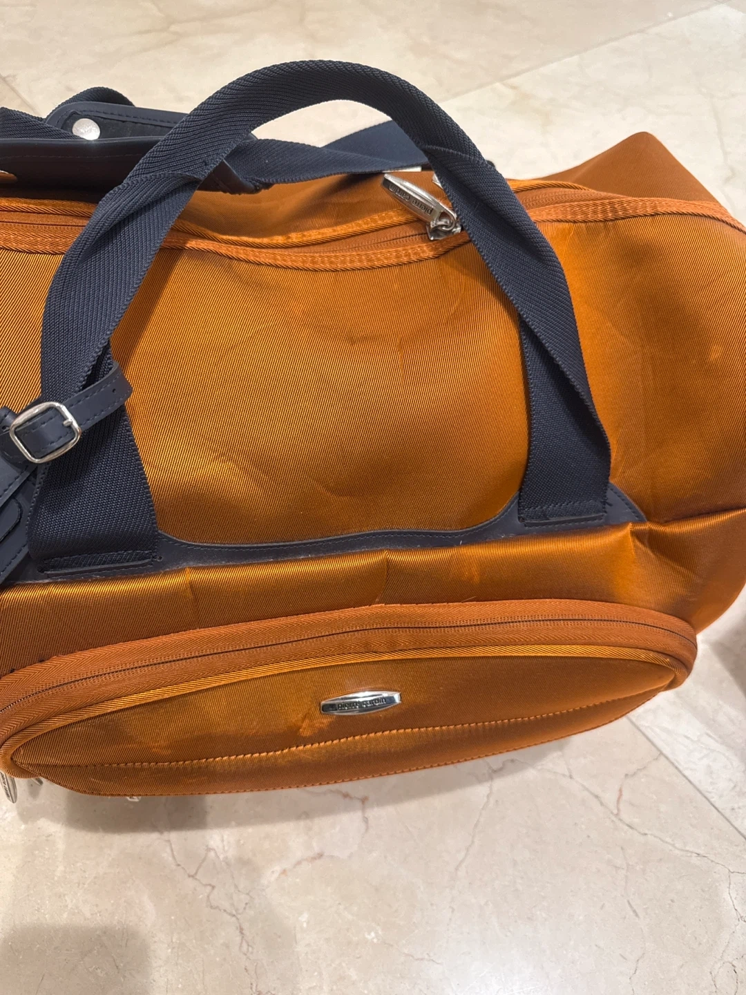 Orange duffel bag with navy blue accents. Features a zippered main compartment and an exterior zippered pocket. Durable nylon material.