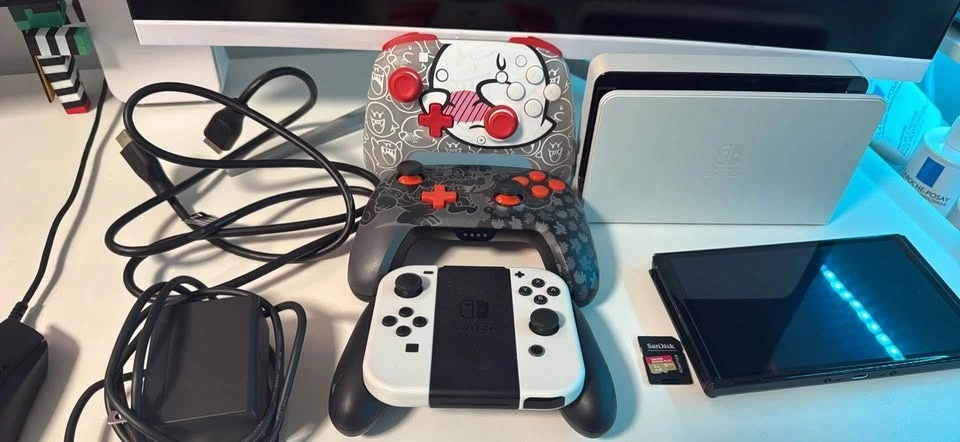 Nintendo Switch OLED console – barely used, only played while docked on a TV. Includes 2 PDP Rematch GLOW Wireless Controllers (Bowser & Boo Hoo editions), a 1TB SanDisk Extreme Plus microSDXC card, and all original accessories and box. Everything is in excellent, like-new condition. Original value around $500 – open to fair offers.