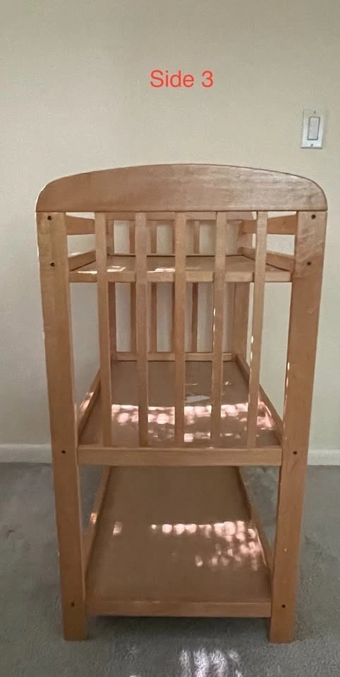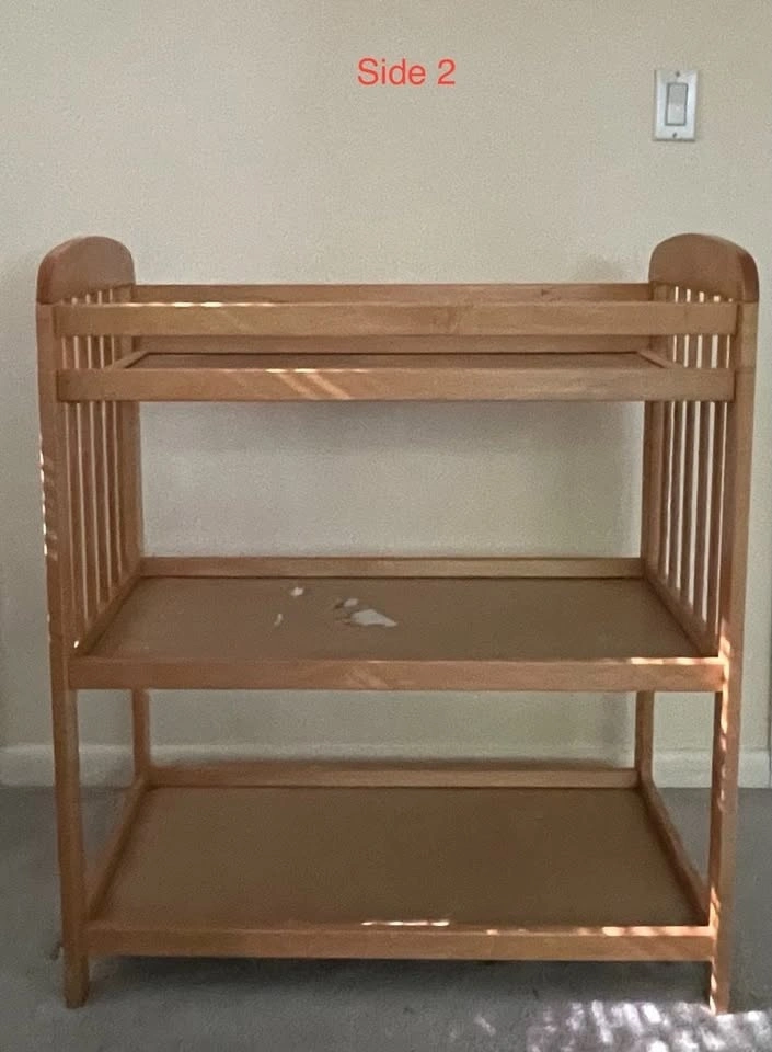 Beautiful vintage changing table featuring two shelves. Due to sanitary reasons, pad not included. Wood species is unknown.