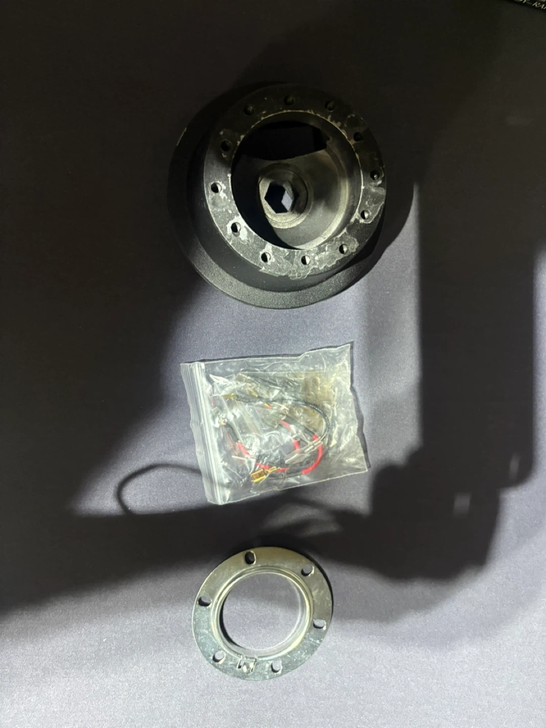 This is a Hub Sports steering wheel hub kit. It includes the main hub, a spacer, and a wiring harness. This kit is compatible with Nardi, Momo, Personal, Abarth, Indy, and Italvolanti steering wheels.