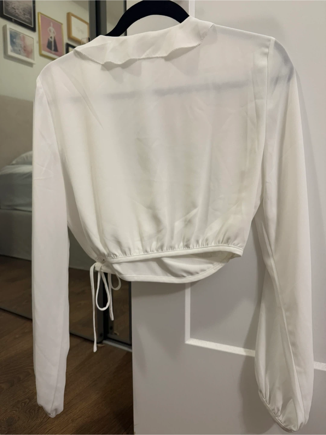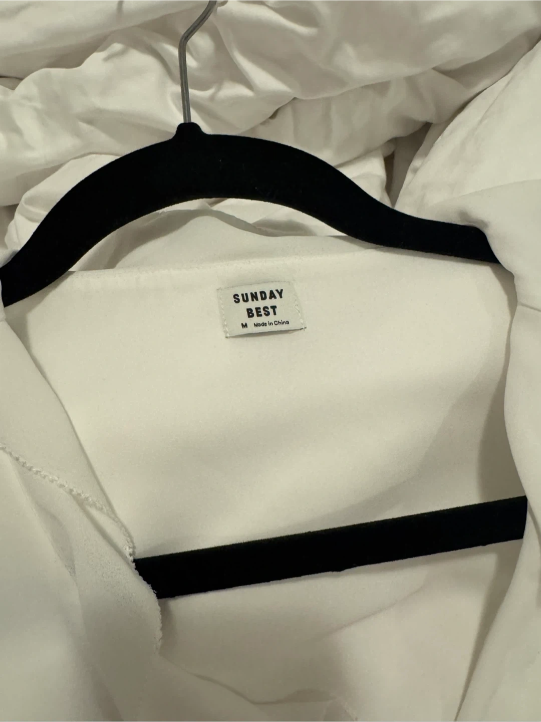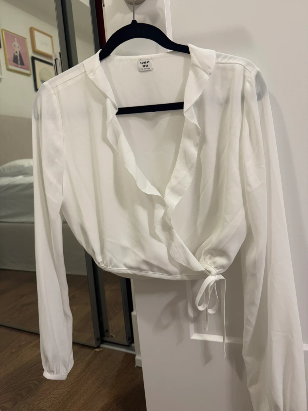 Selling a cute white wrap blouse from Sunday Best! It's a size medium and has never been worn. Perfect for a night out or dressing up a casual look!