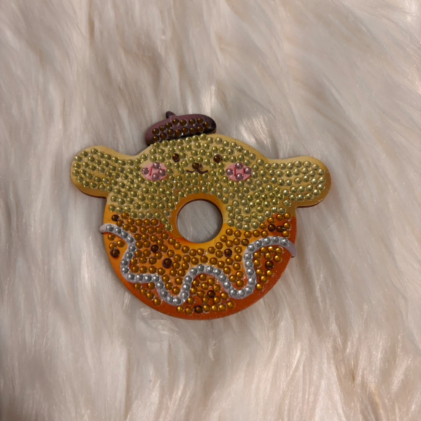 This is a cute wooden donut coaster. It's decorated with rhinestones and has a little beret on top.