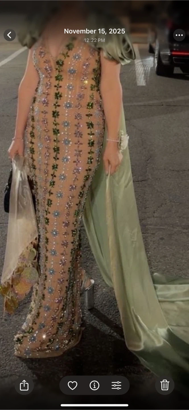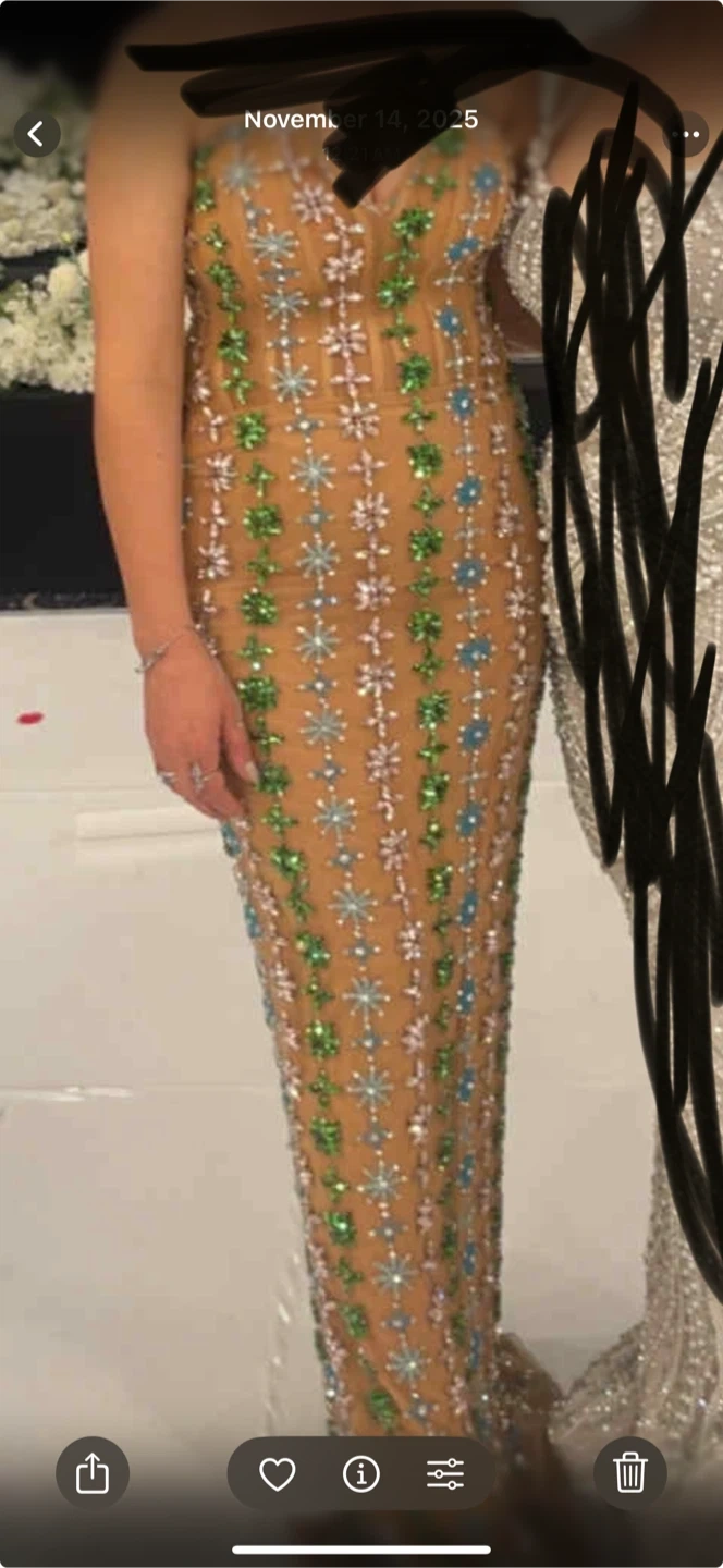 This stunning floor-length gown is covered in intricate beadwork and sequins. It features a fitted silhouette and a flowing train. Perfect for a formal event or gala!
