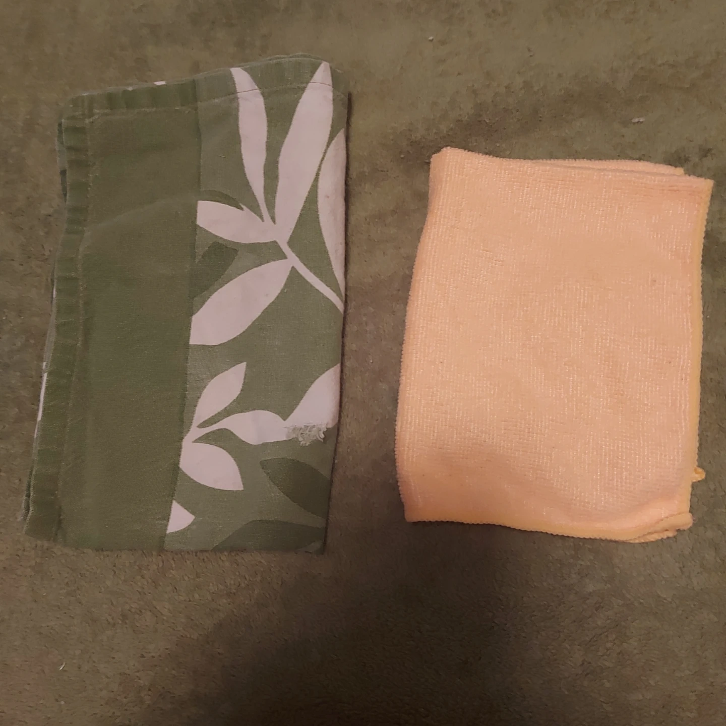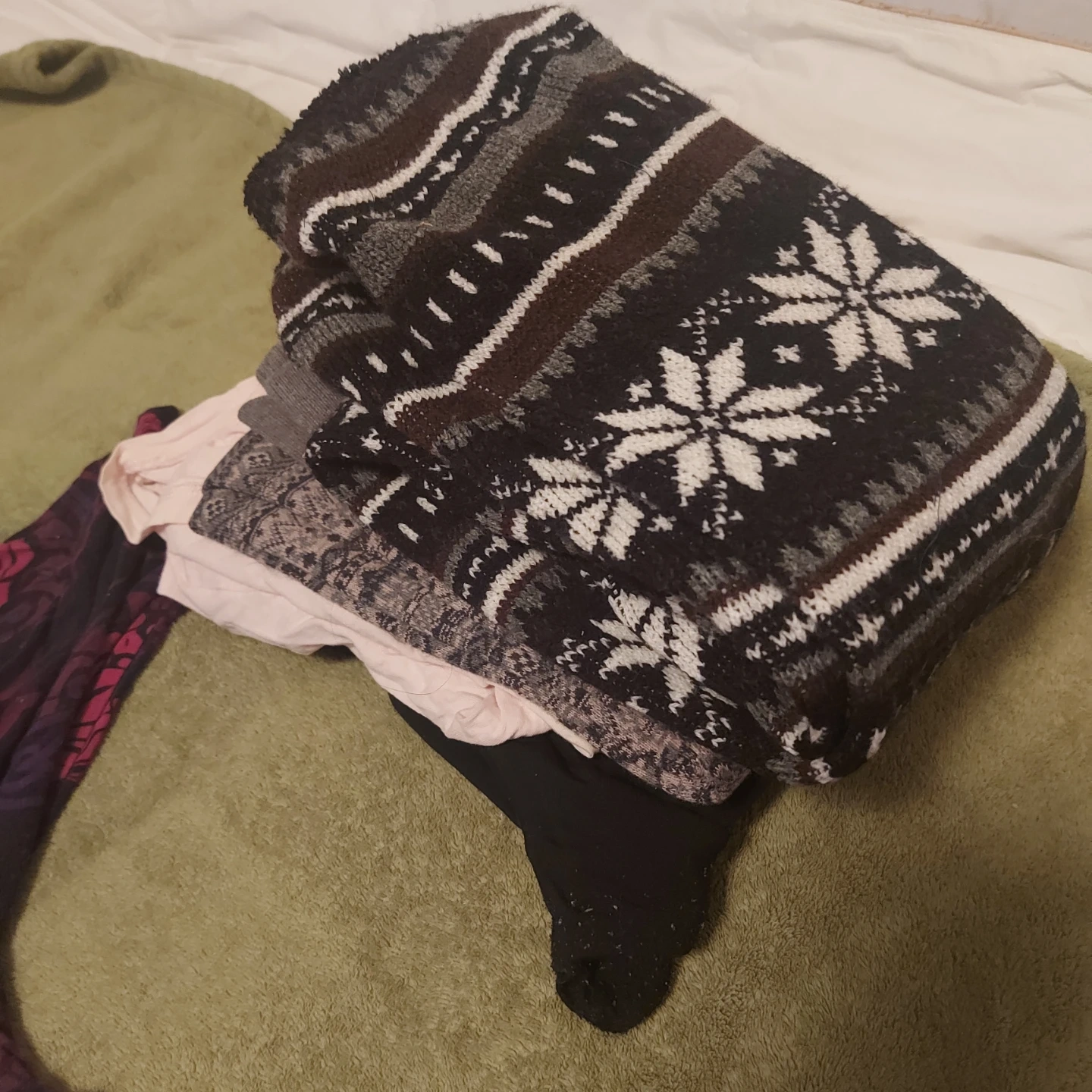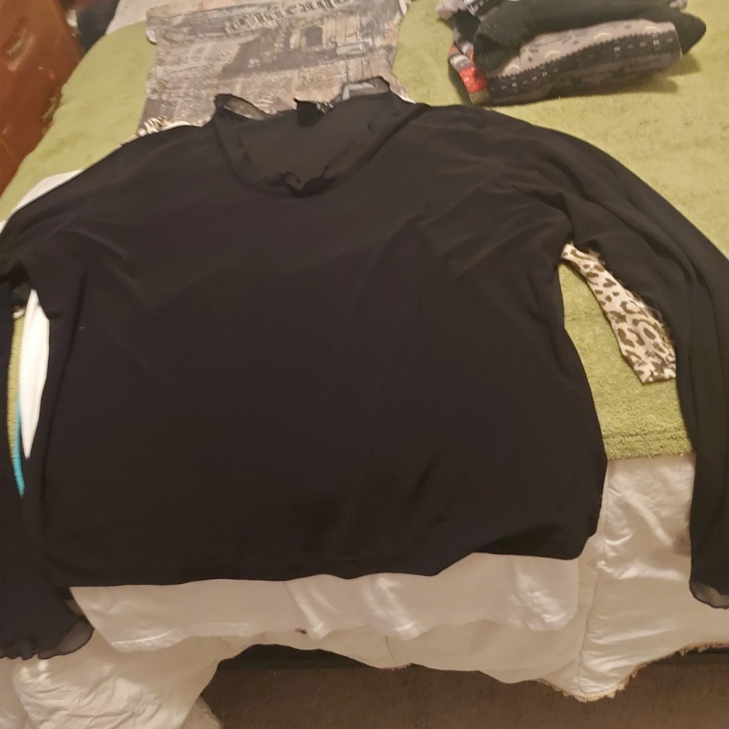 Bundle includes a black long-sleeve sheer top with ruffled neckline, a purple and pink floral print dress, and black leggings. The sheer top has a size tag that reads 'M'. Peach Face cloth, Apple green tea towel.