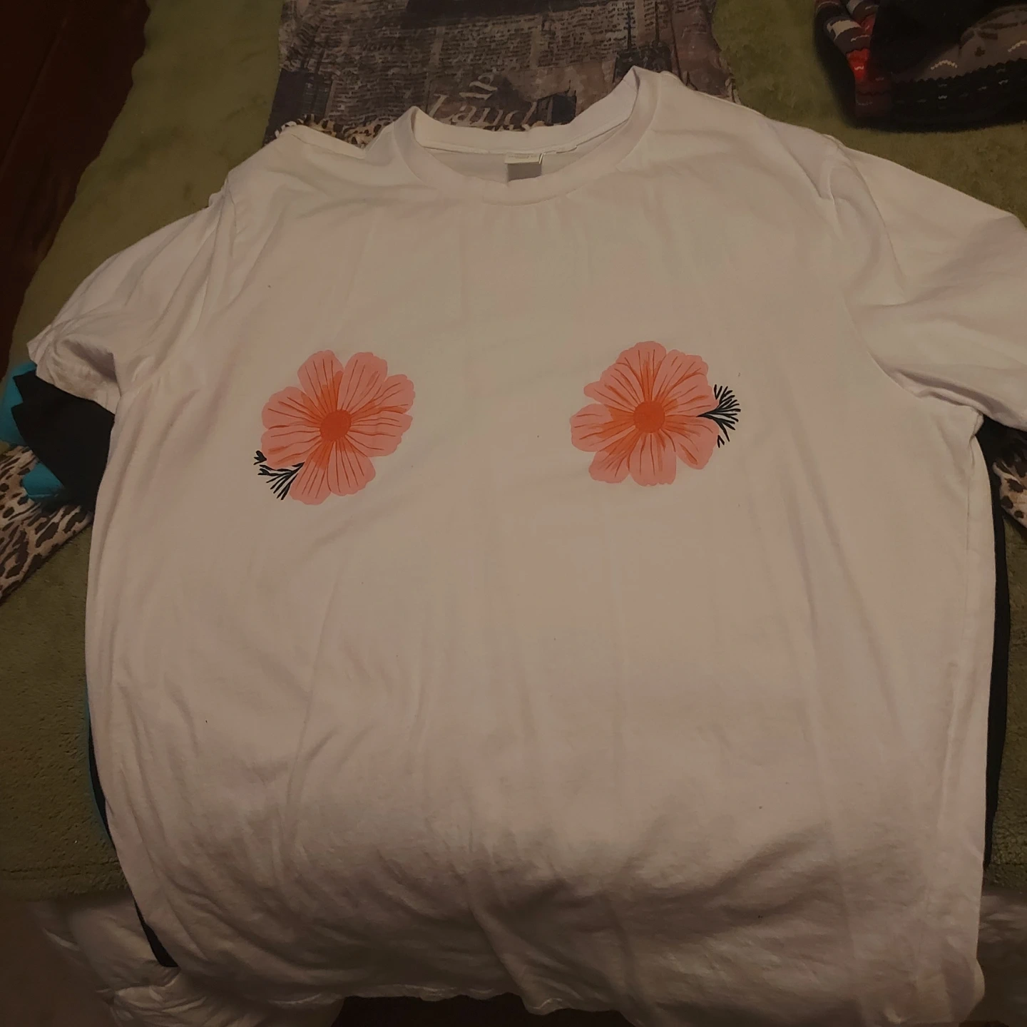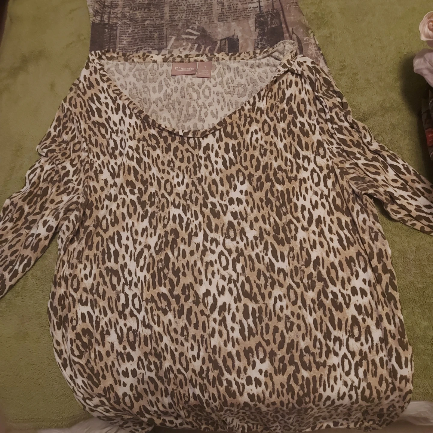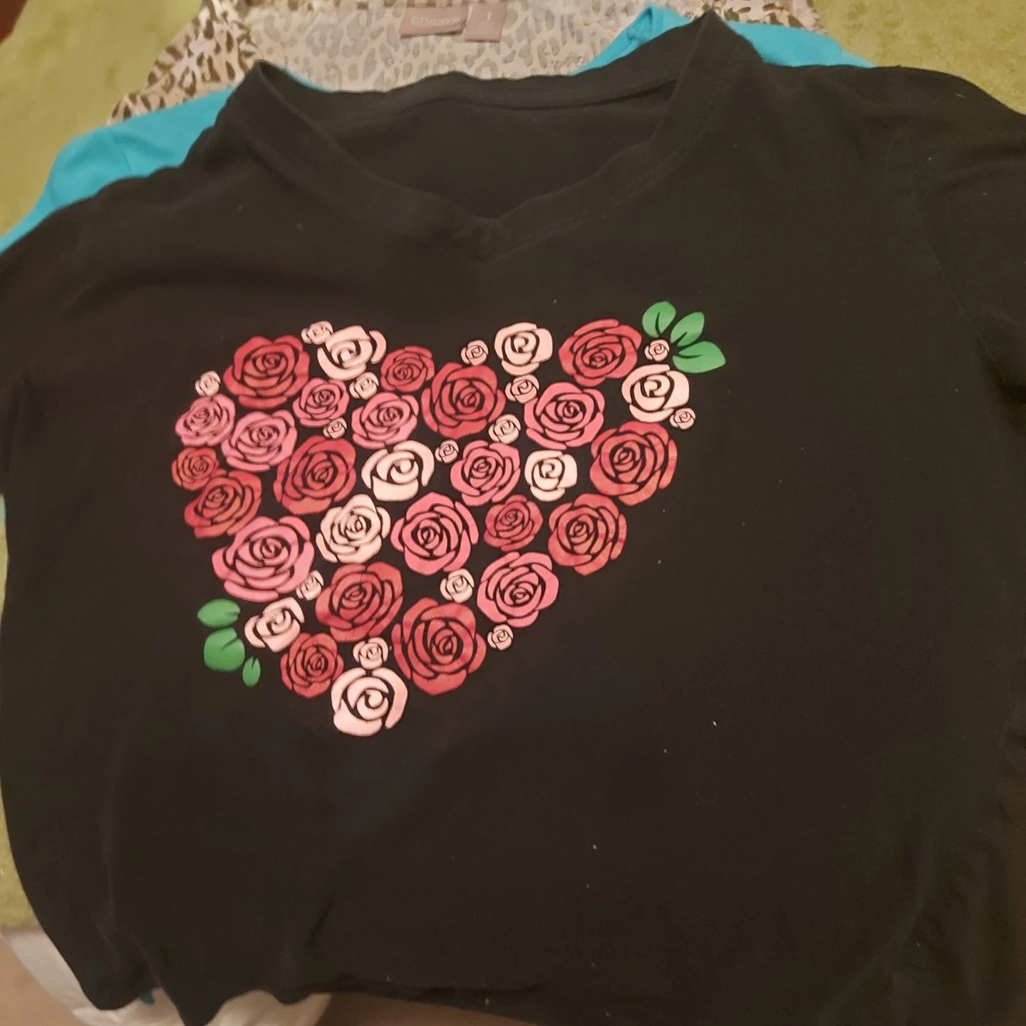 Bundle includes a black long-sleeve sheer top with ruffled neckline, a purple and pink floral print dress, and black leggings. The sheer top has a size tag that reads 'M'. Peach Face cloth, Apple green tea towel.