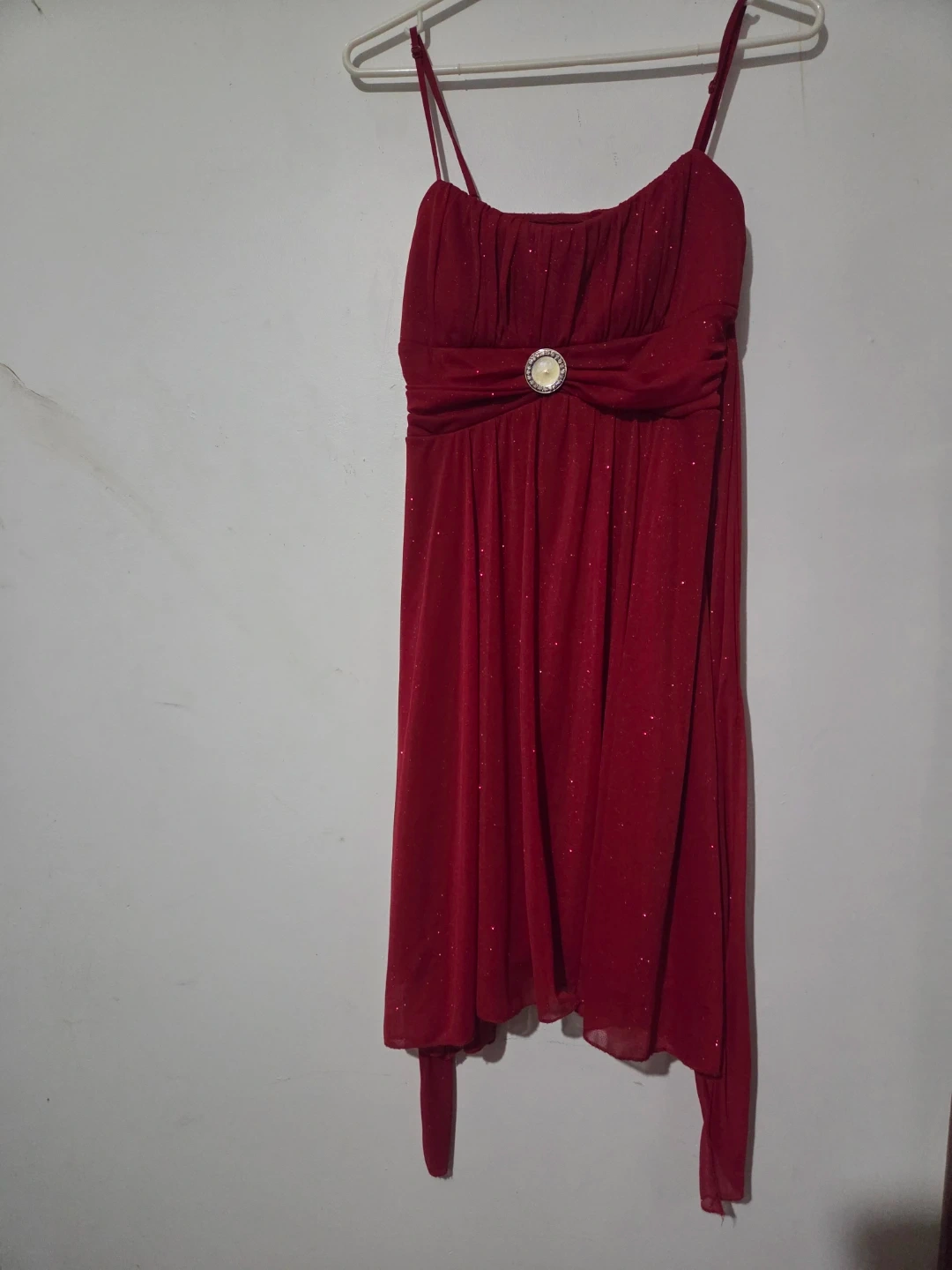 This stunning red dress features a sparkly fabric throughout. It's a size medium with a sweetheart neckline and a decorative jeweled embellishment at the bust. The adjustable spaghetti straps offer a comfortable fit.