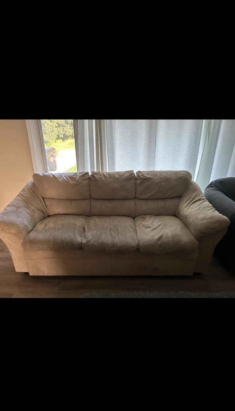 This is a light beige three-seater sofa. It's made of a soft fabric material. Plenty of seating for family or guests!