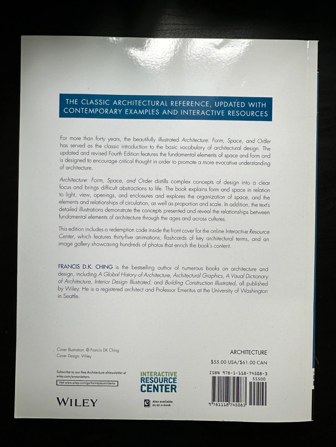 Fourth edition textbook by Francis D.K. Ching. Excellent resource for architecture students. Numerous illustrations and diagrams to help budding architects.