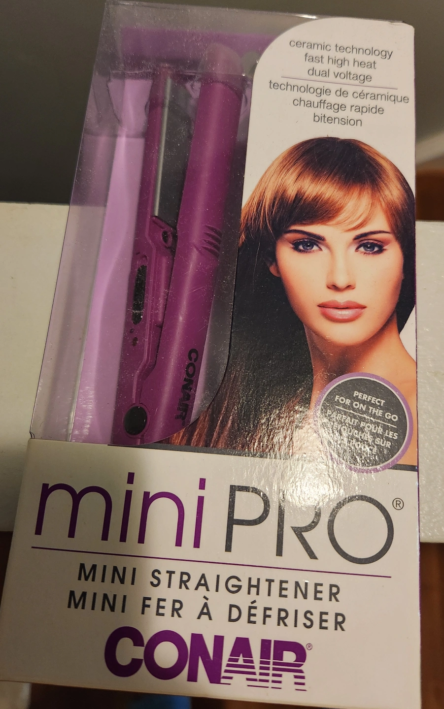 Purple mini hair straightener. Ceramic technology, fast high heat, dual voltage. Perfect for on-the-go touch-ups.