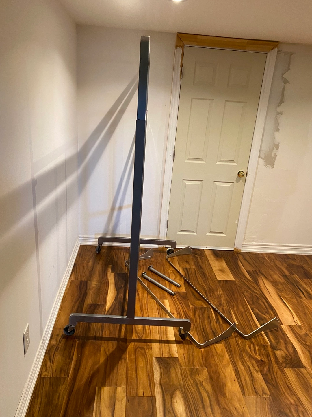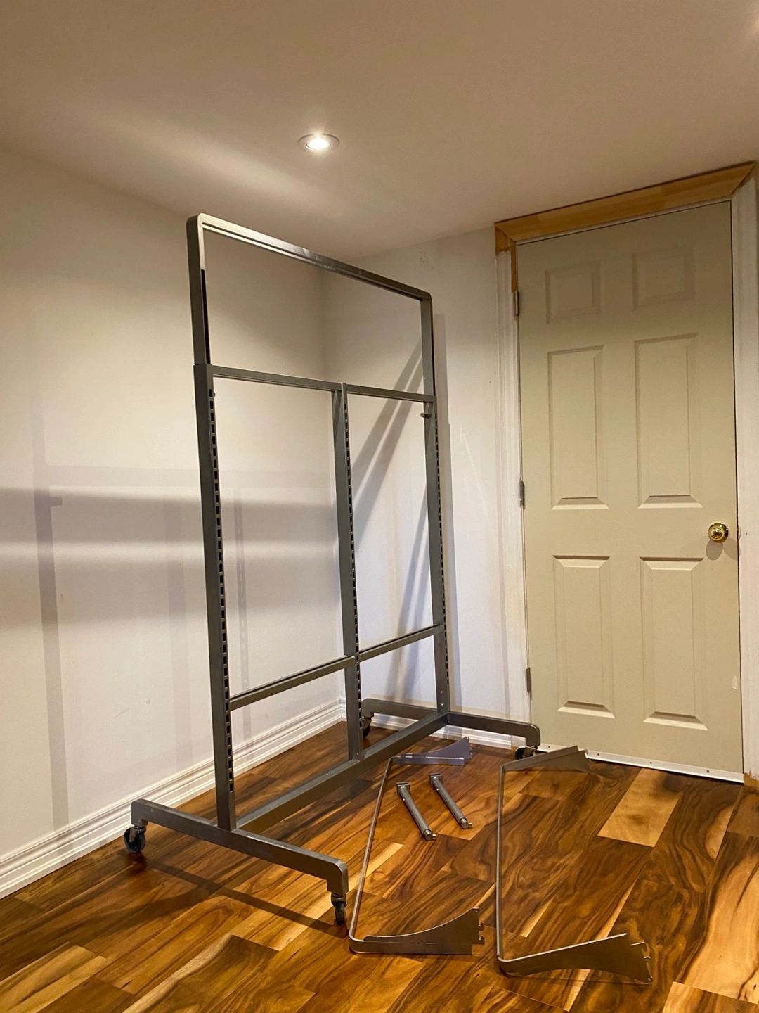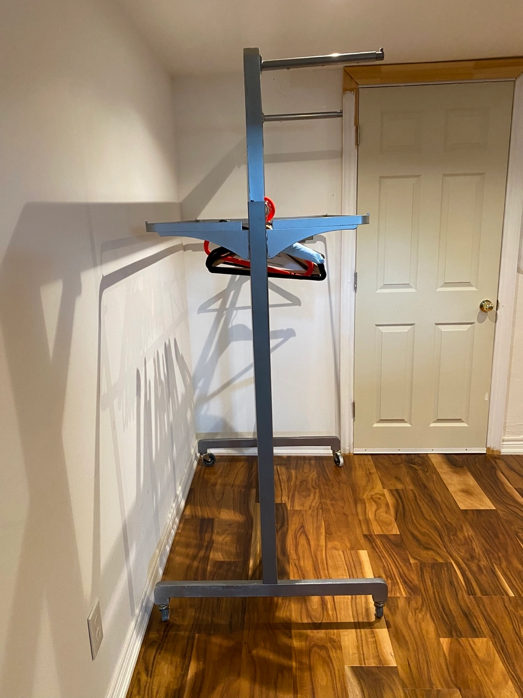 89Double hanging rack, great for retail or home use. Metal construction, sturdy and mobile. Includes shelves. From Target store.