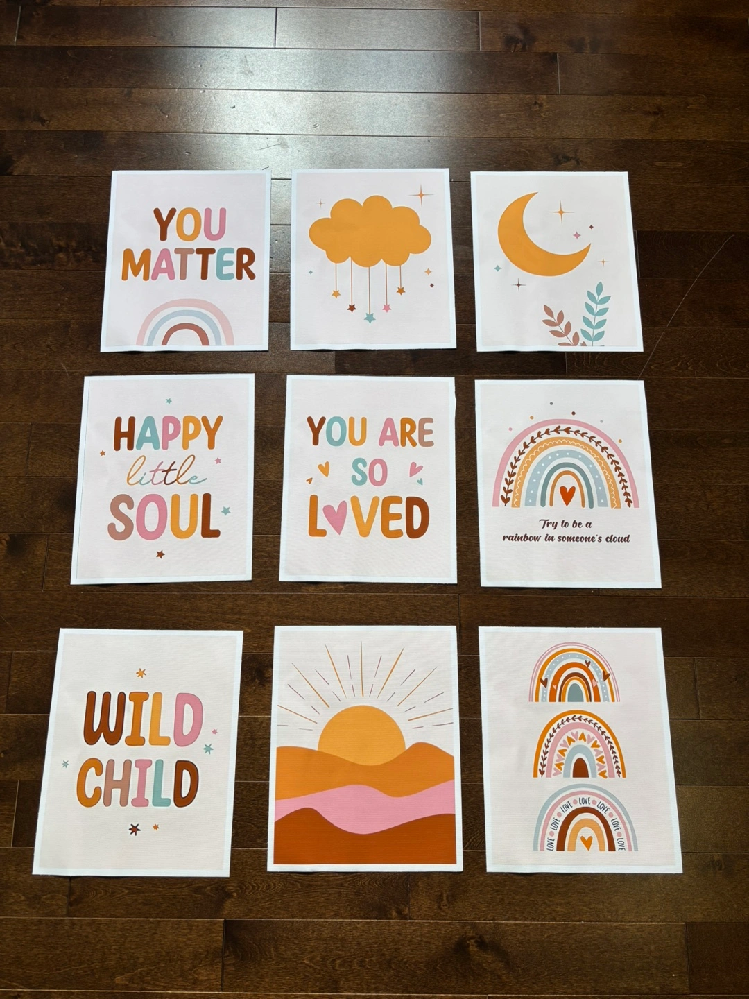 9 prints featuring rainbows, moons, clouds, and positive messages. Perfect for a nursery or child's room. Prints are unframed.